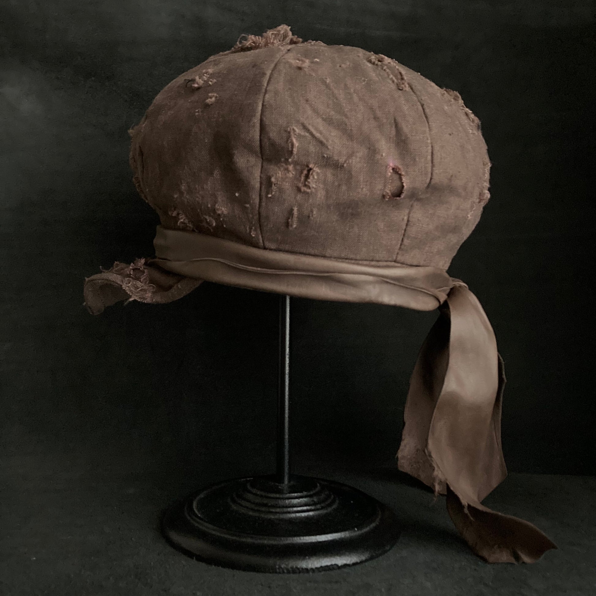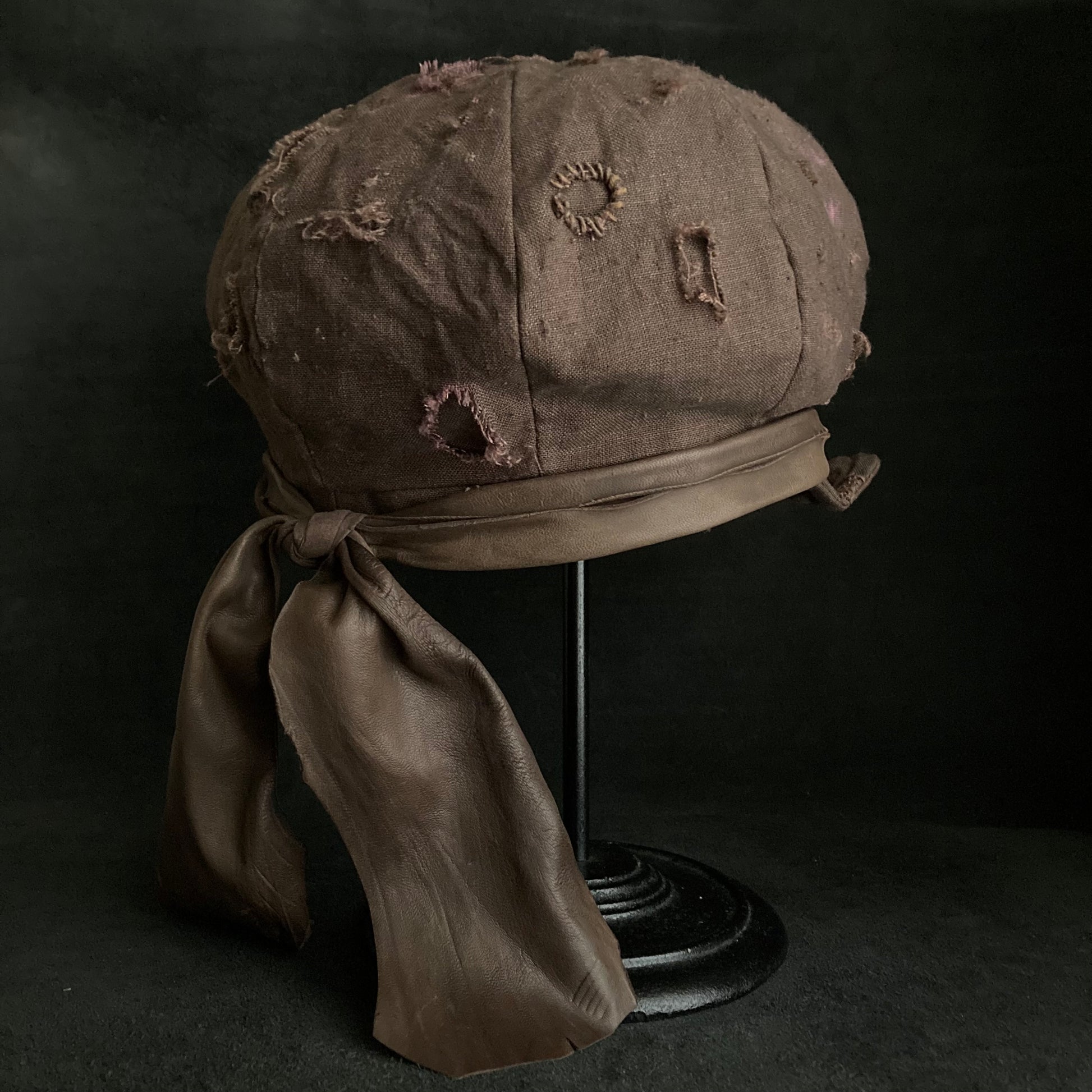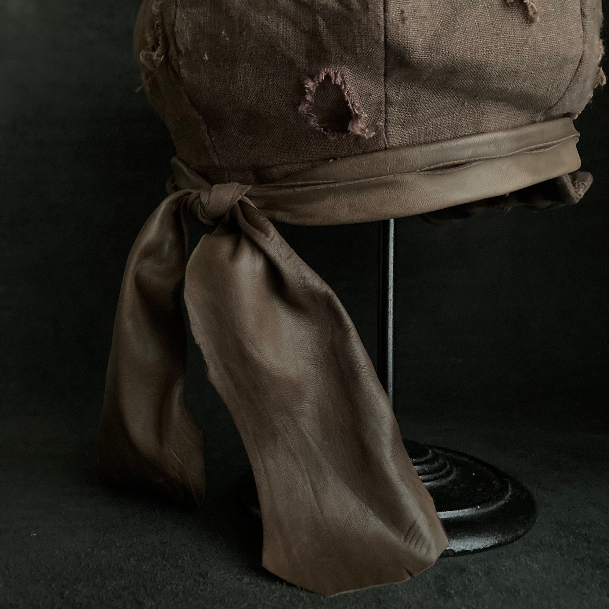 飾りには、ブリーチ加工したブラウンのレザーを後ろに垂れ下がるように巻いています。
