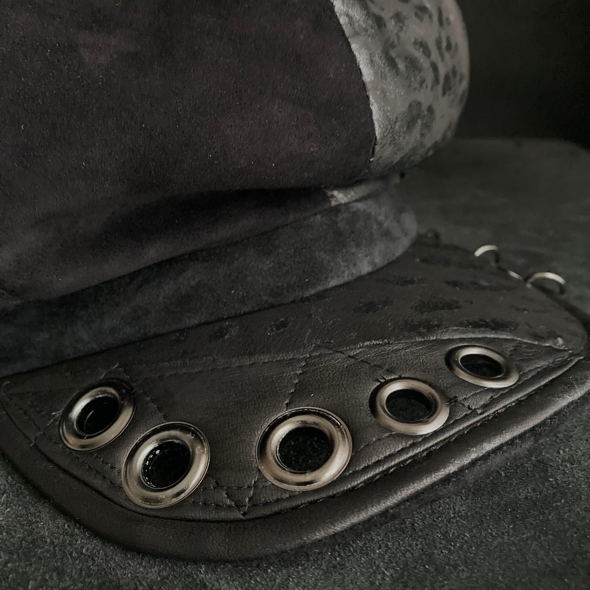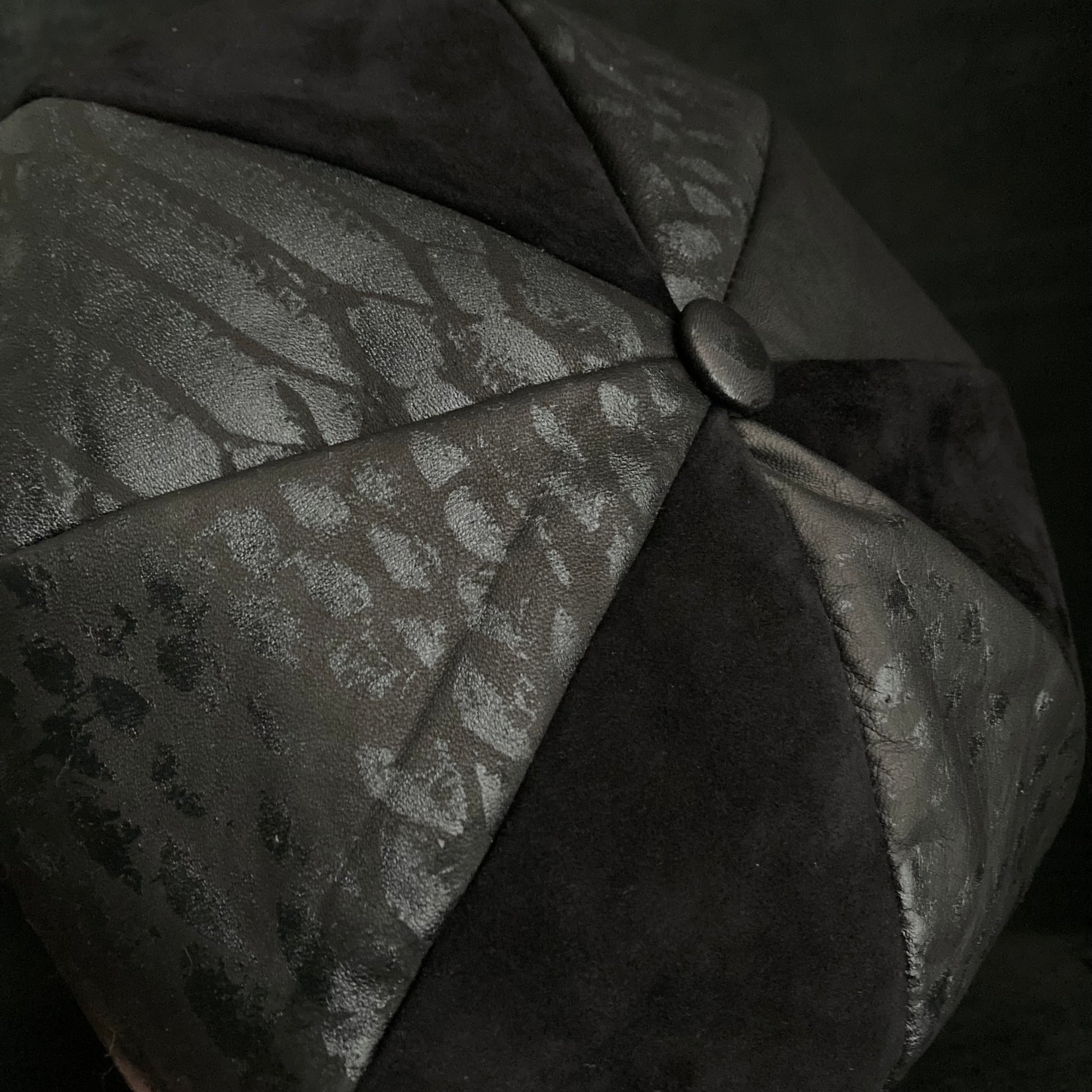 We created a newsboy cap using rubber-printed leather. The silver side and the soft side of the leather are used separately.