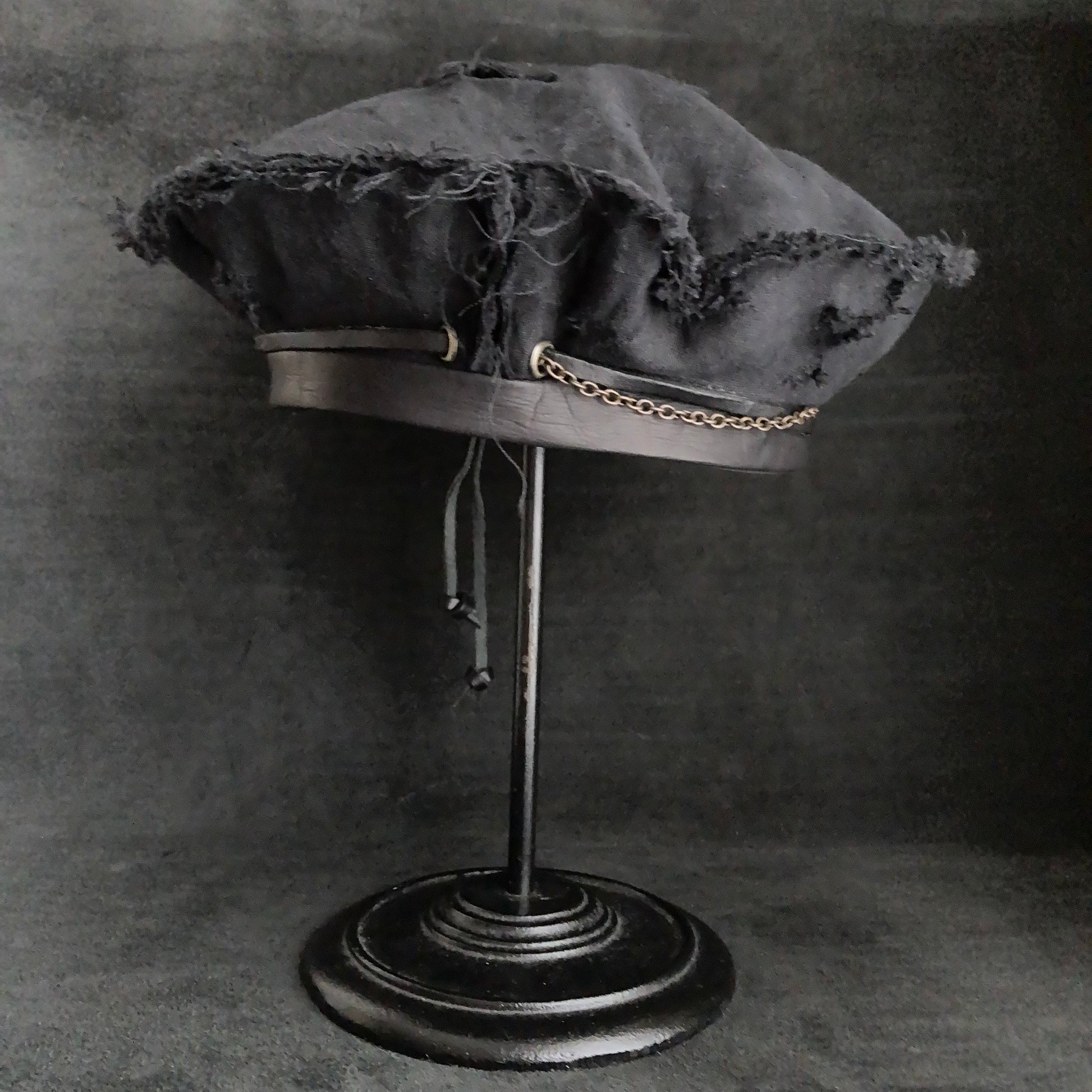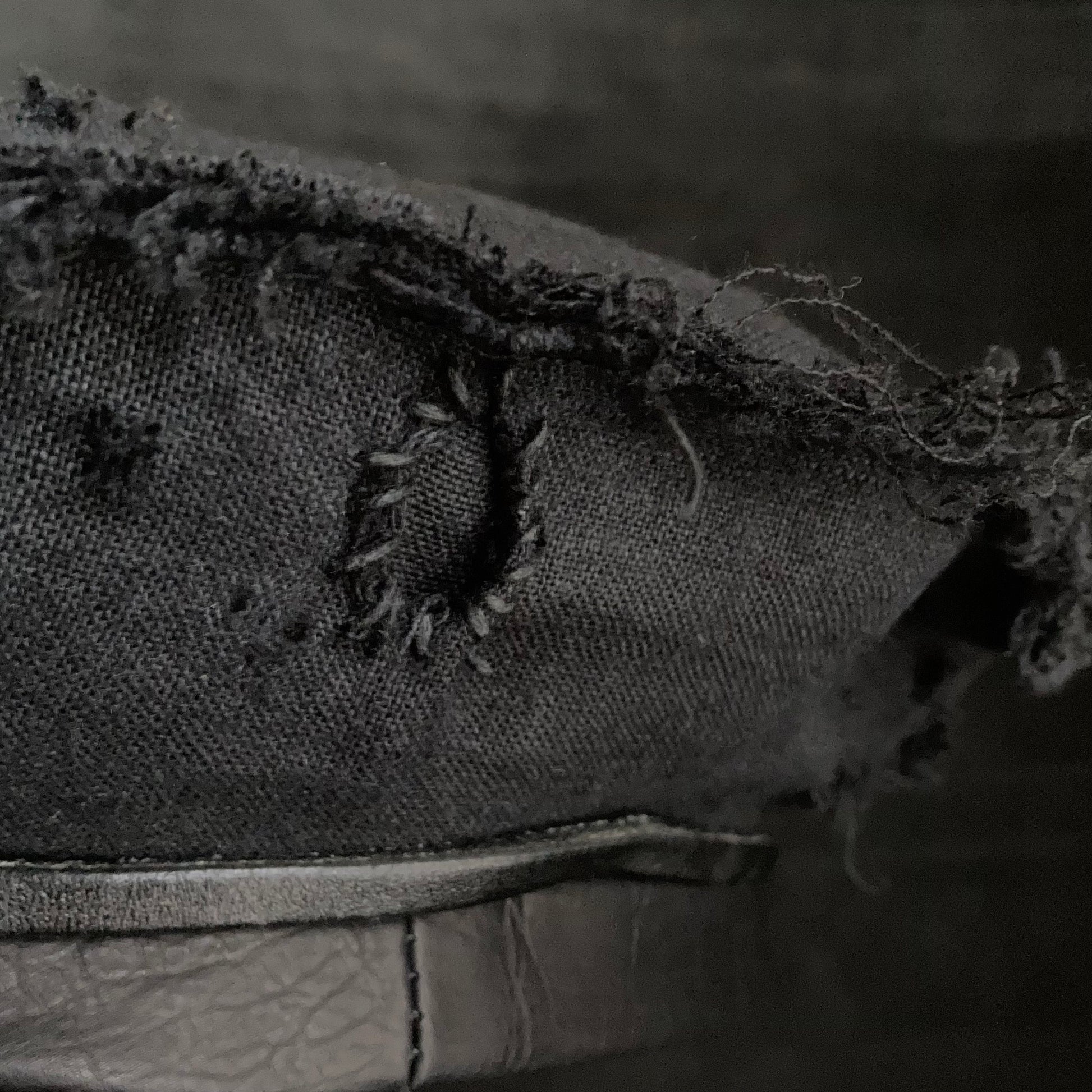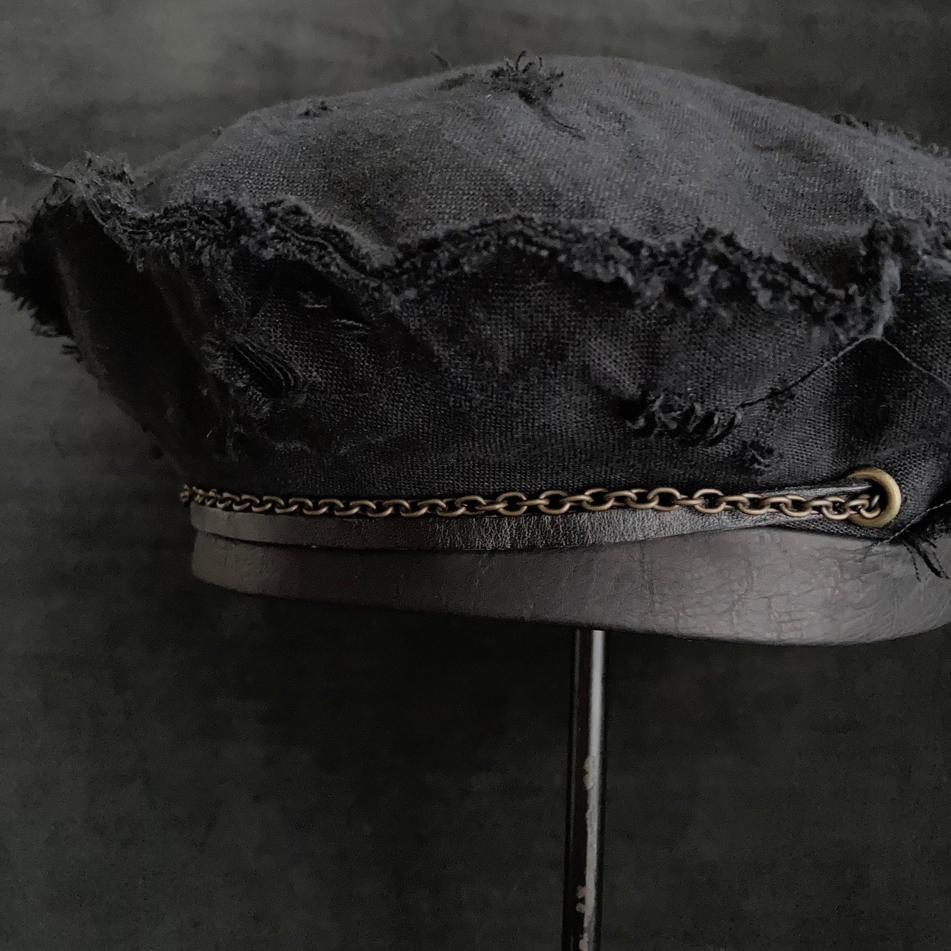 サイドにハトメを打ち込み、革ヒモ,アンティークゴールドのチェーンを通しています。