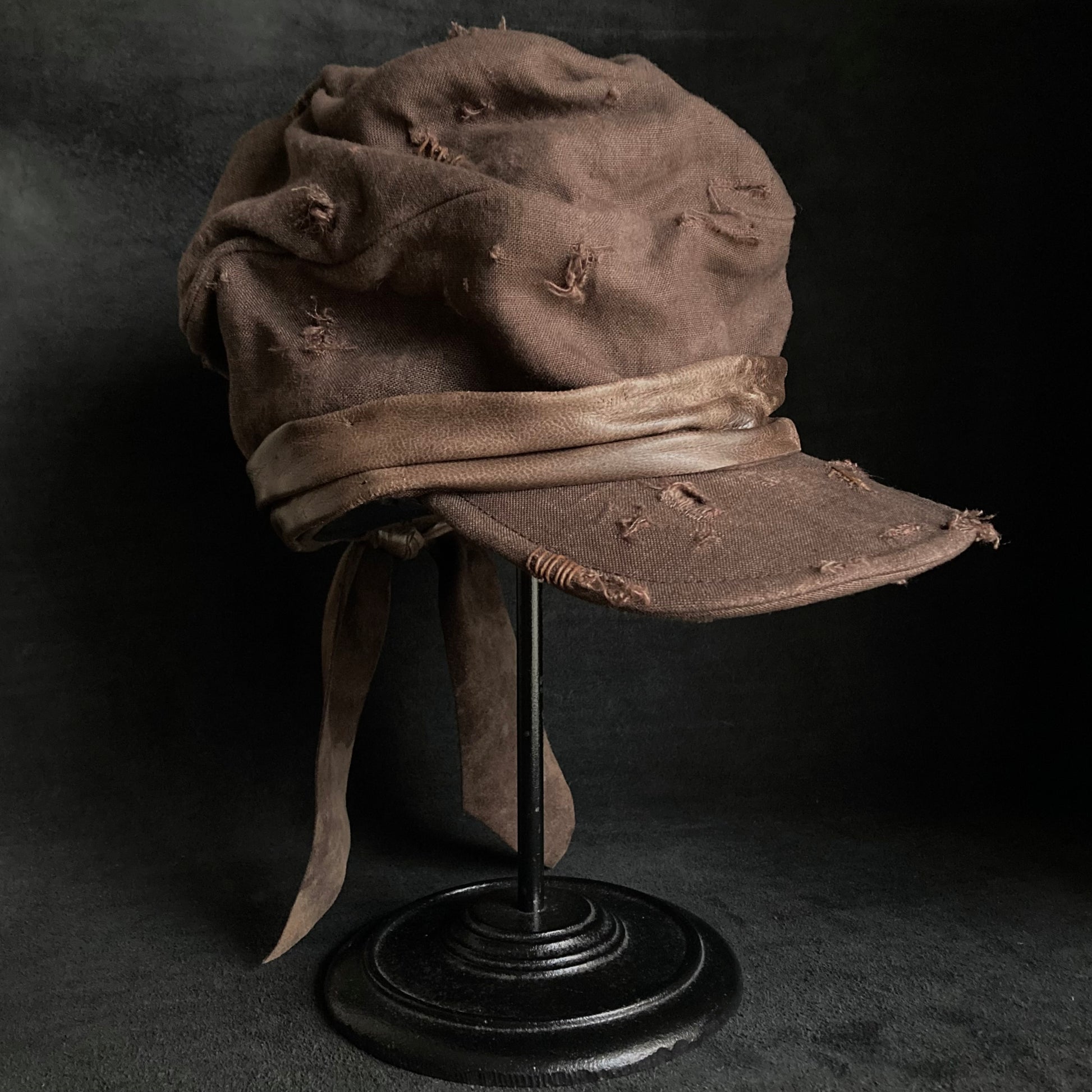 飾りには、ブリーチ加工したブラウンのレザーを後ろに垂れ下がるように巻いています。