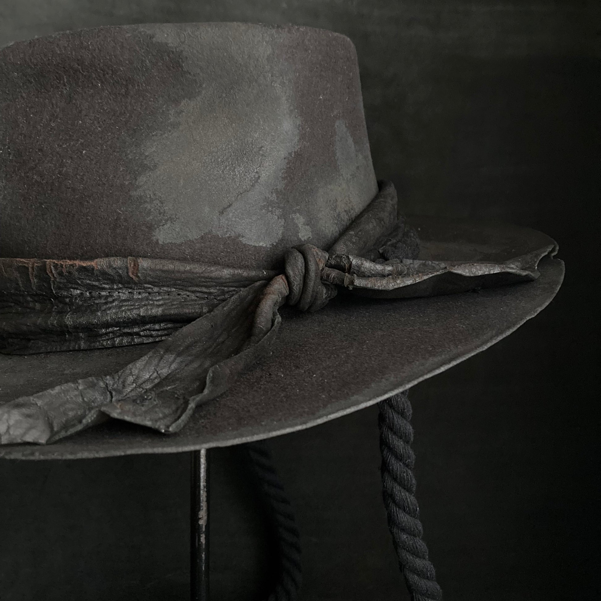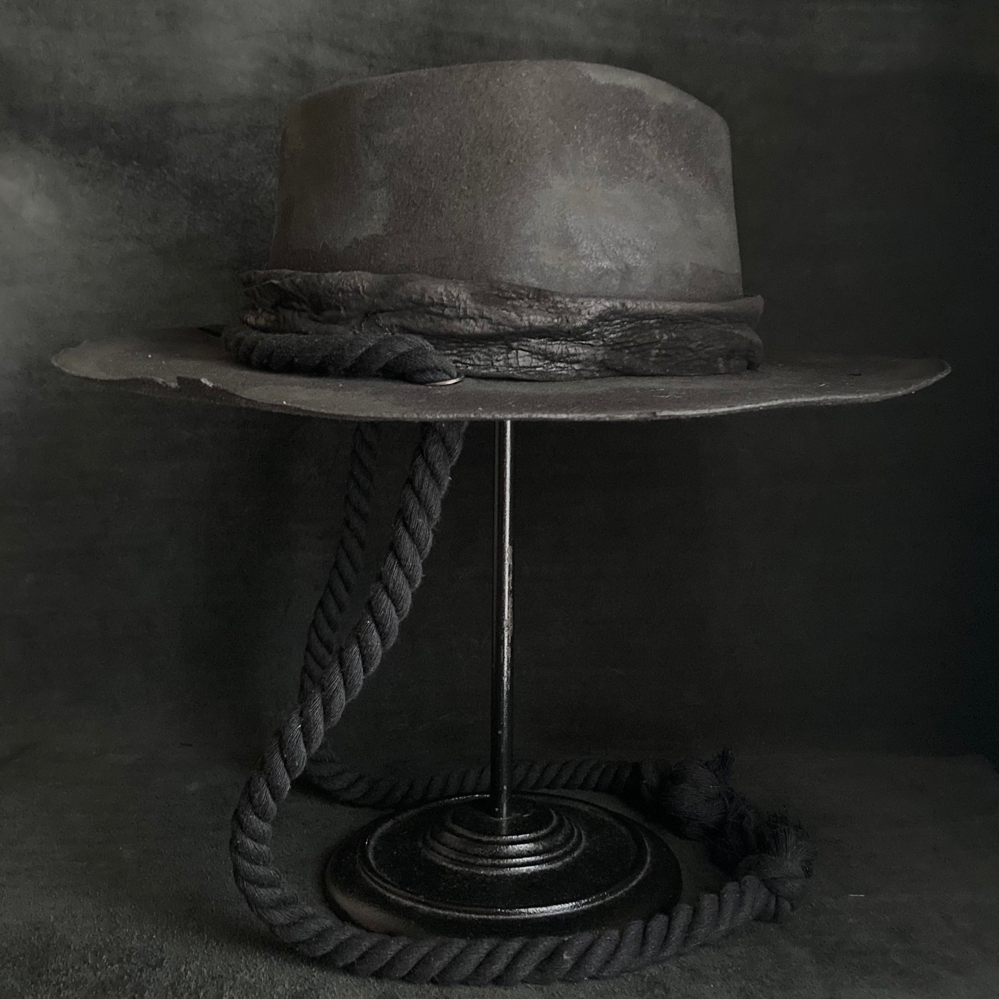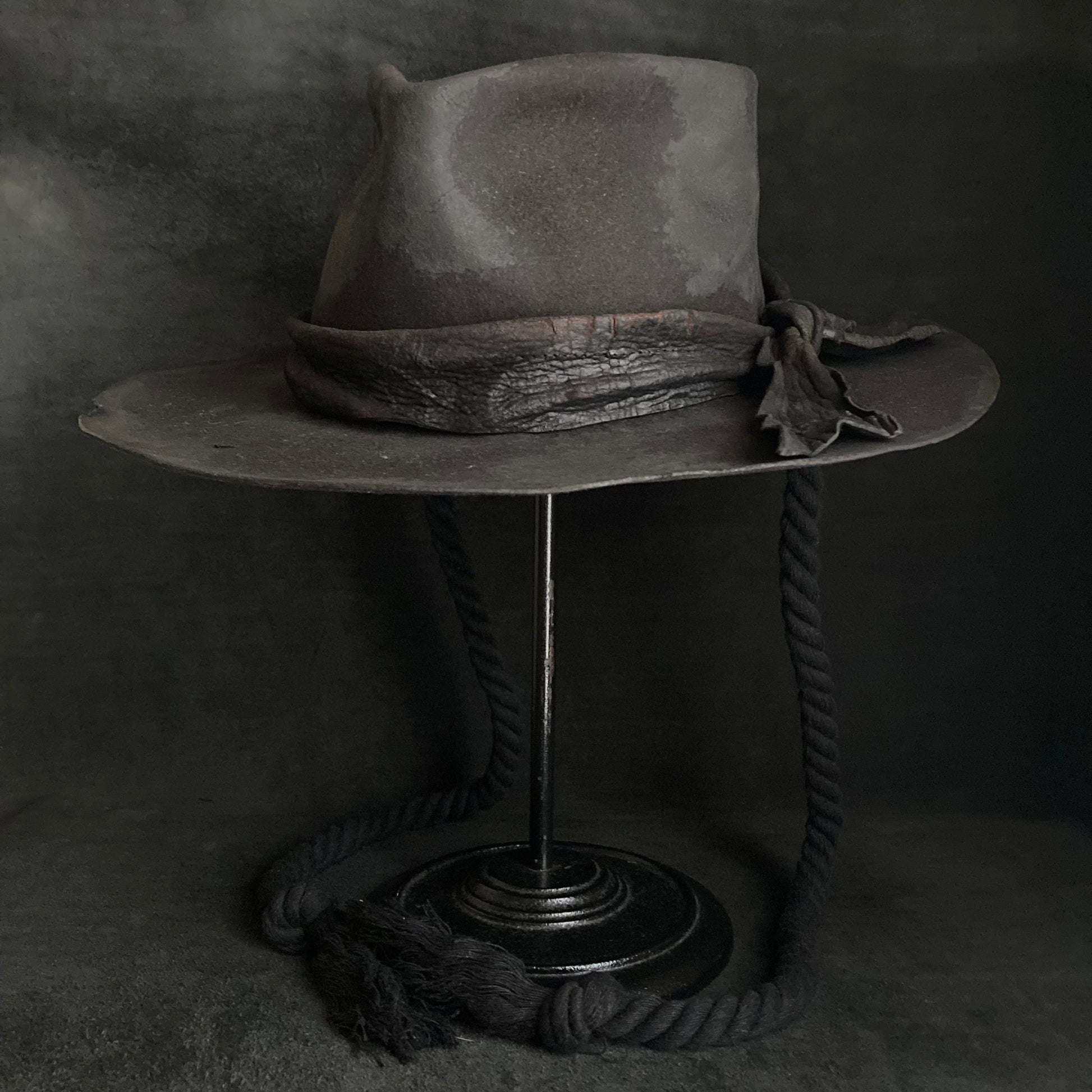 ブリムに穴をあけて、ロープが耳の後ろから垂れ下がるようにしています。