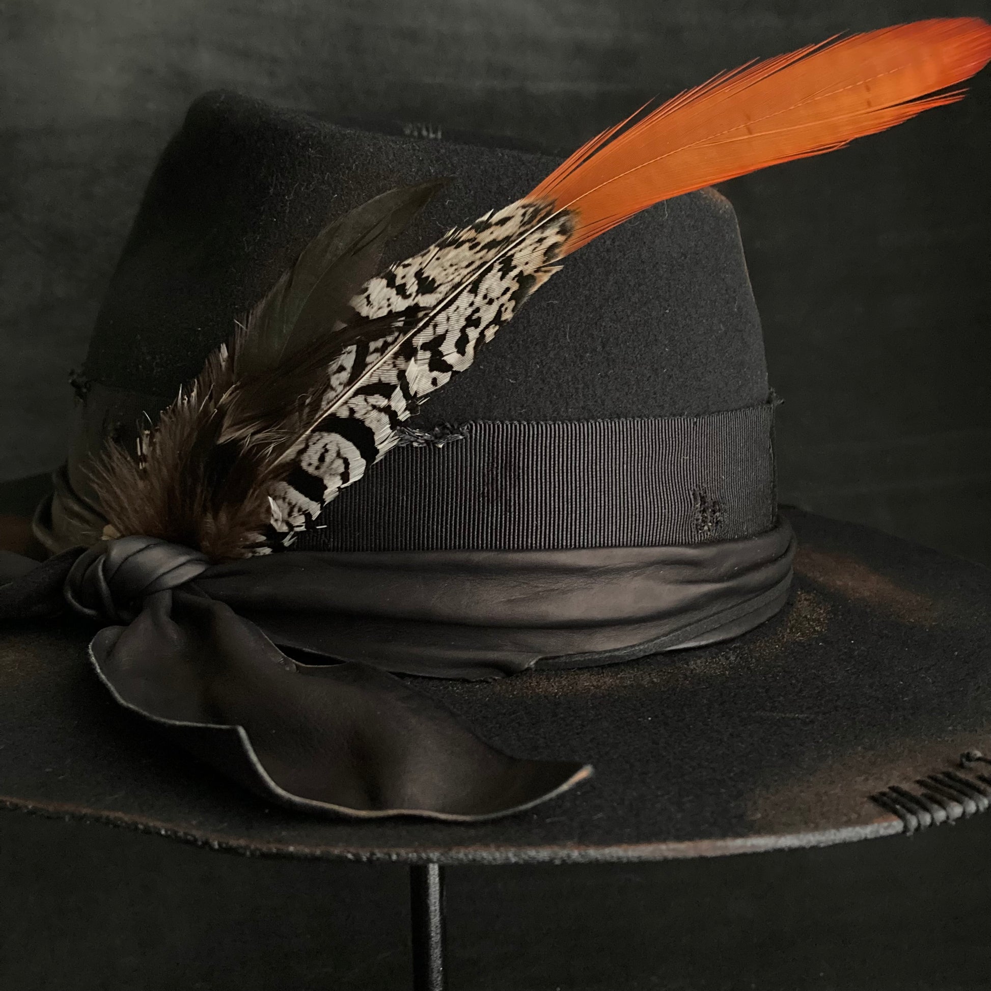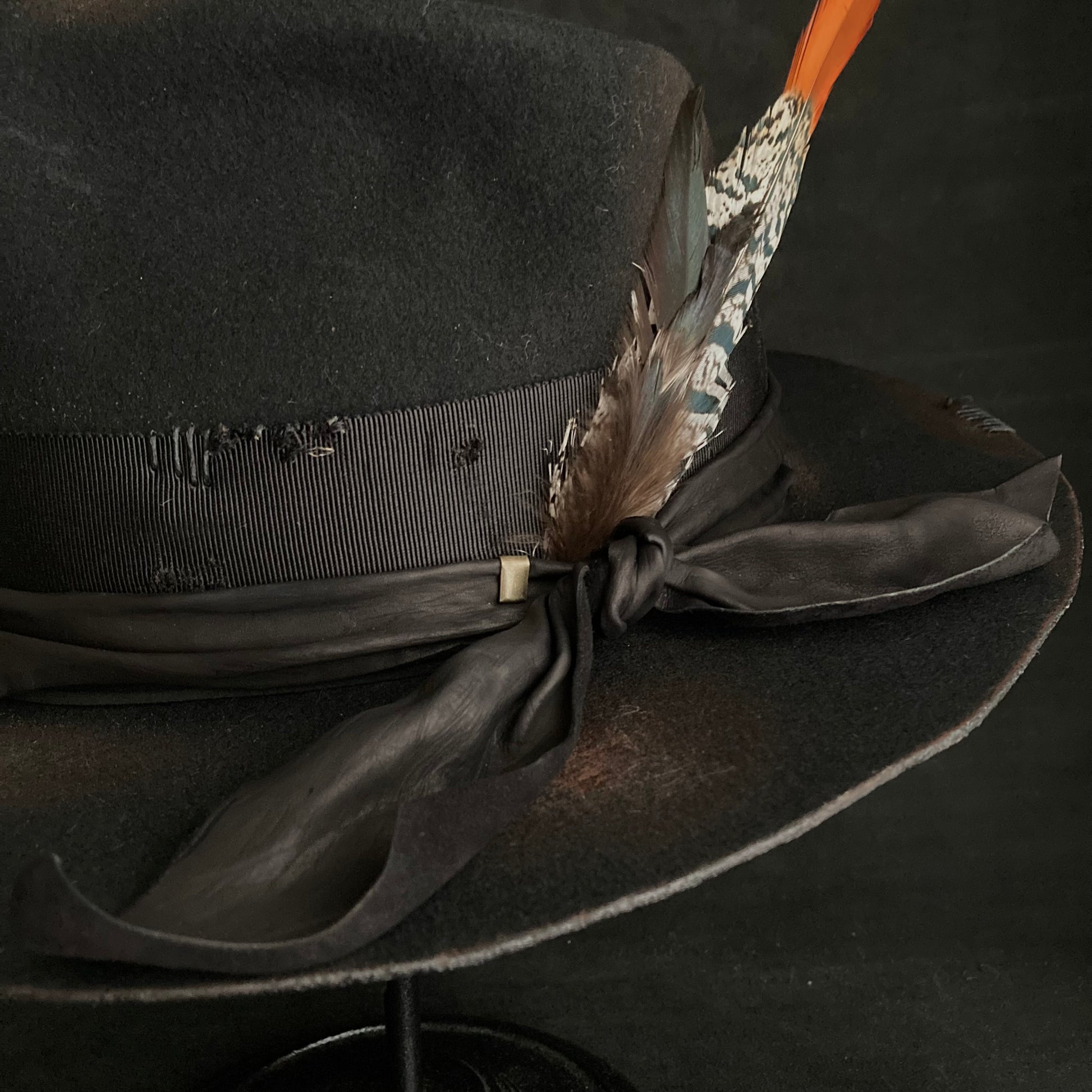 飾りにはレザー、グログランリボン、羽根、革紐、金具を使用しています。