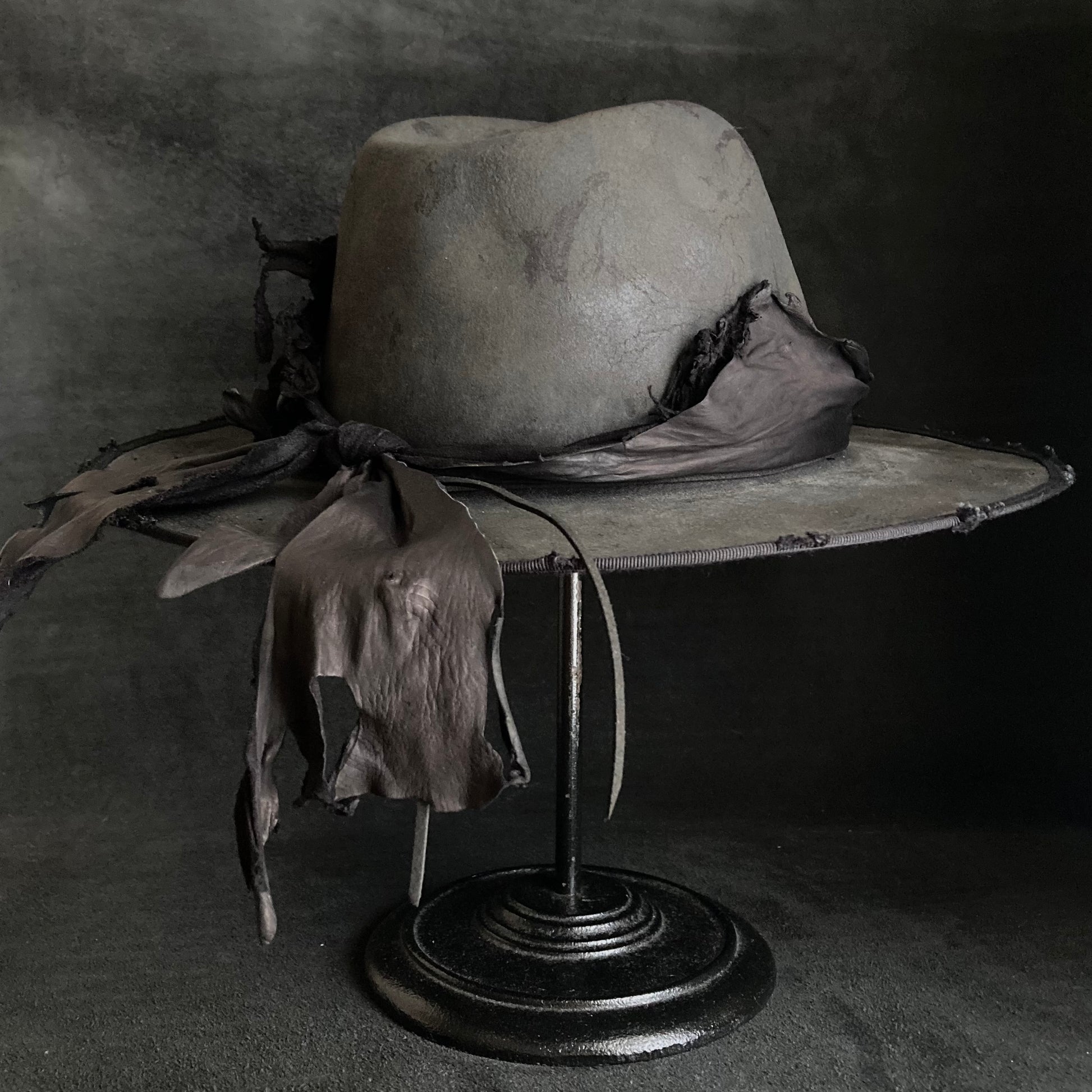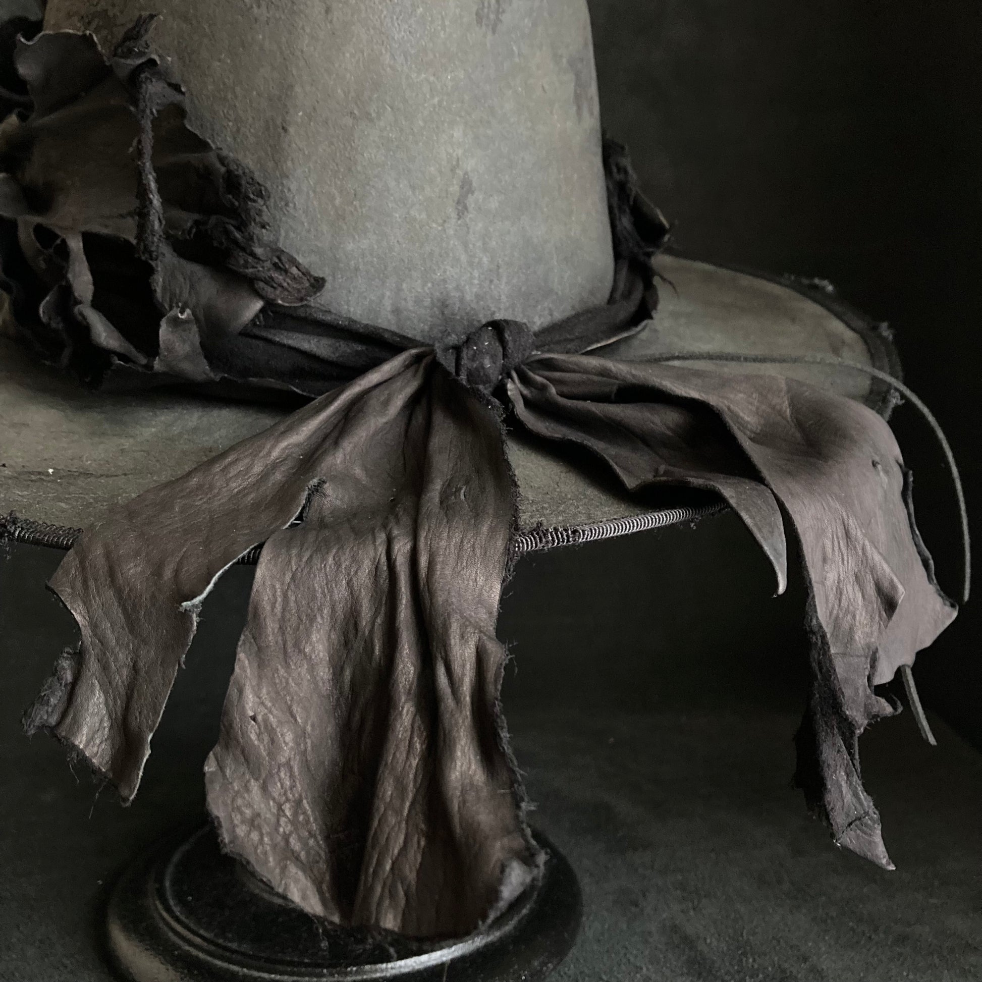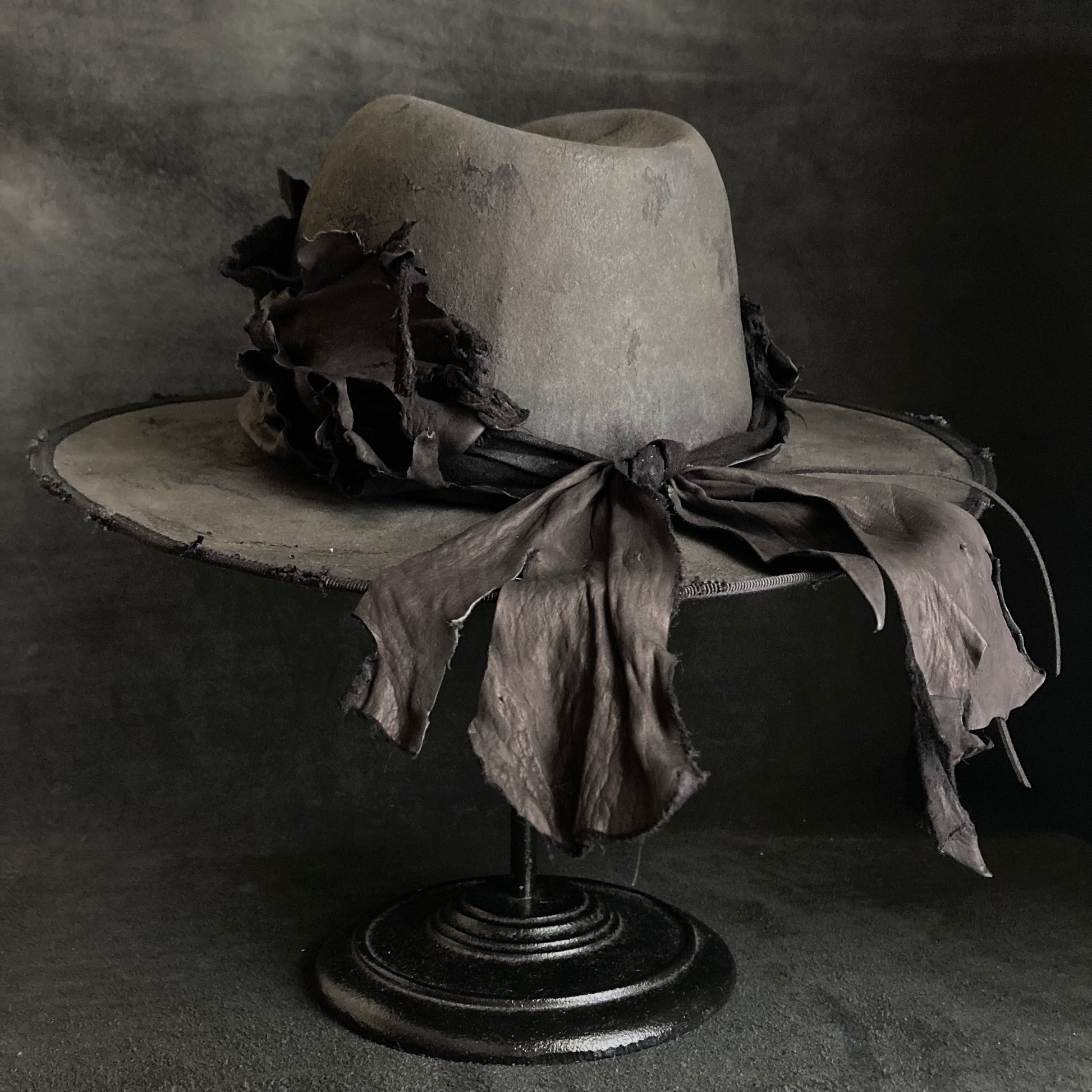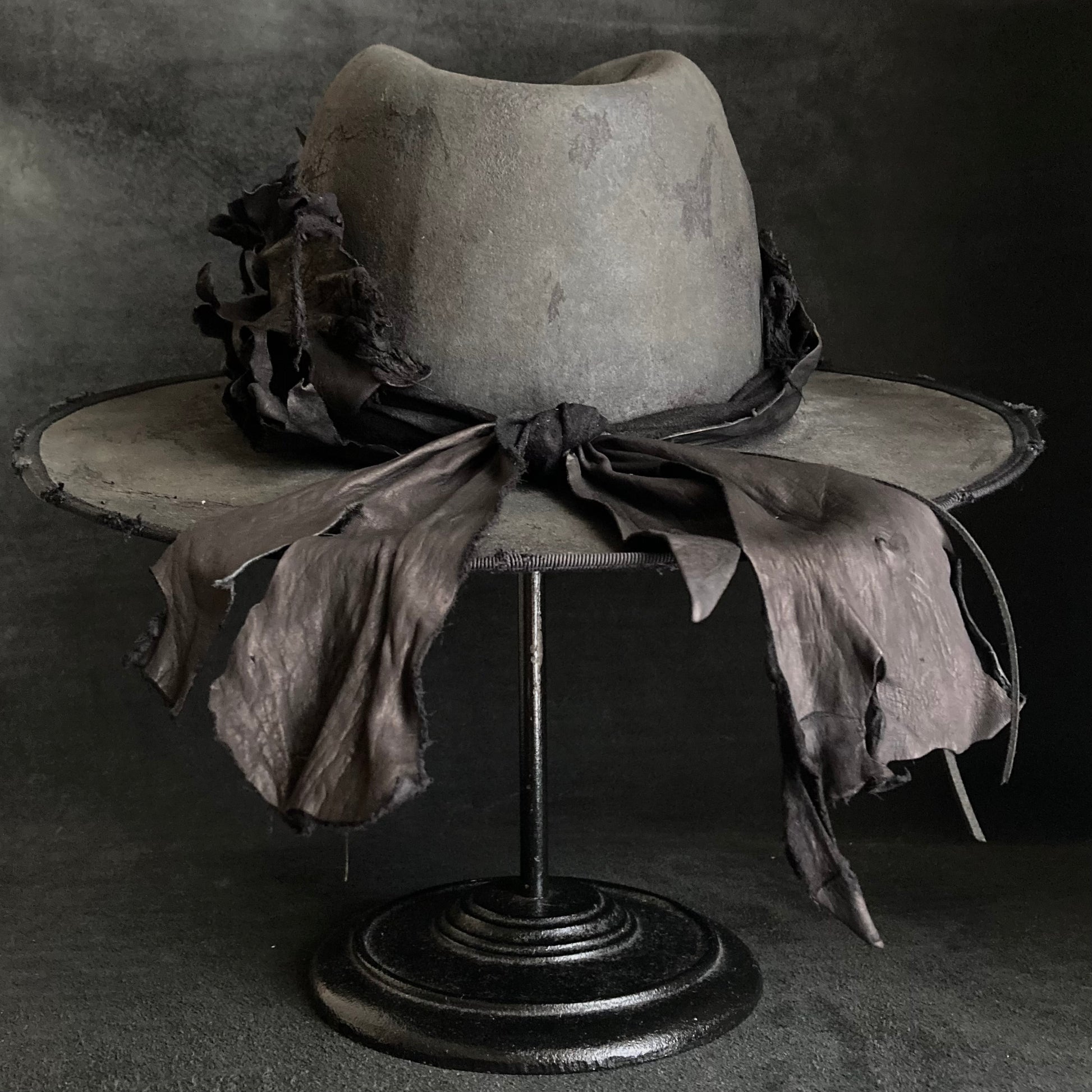 飾りはバック中心で、ブラックのレザーを帽子を覆うように巻いています。