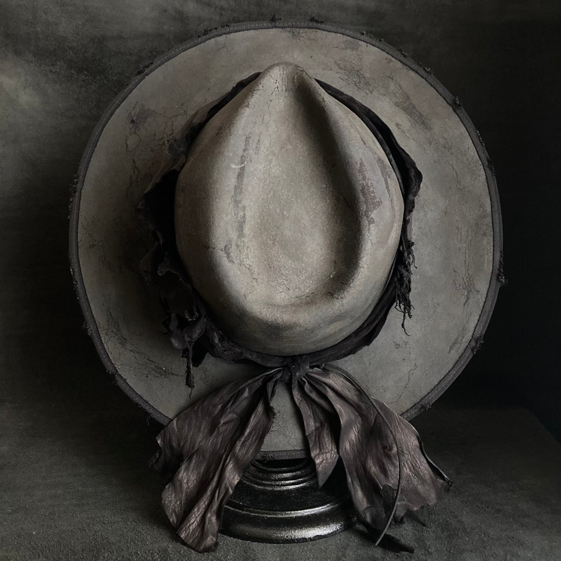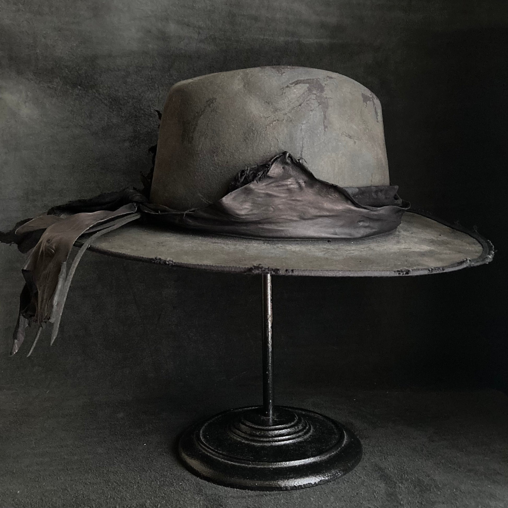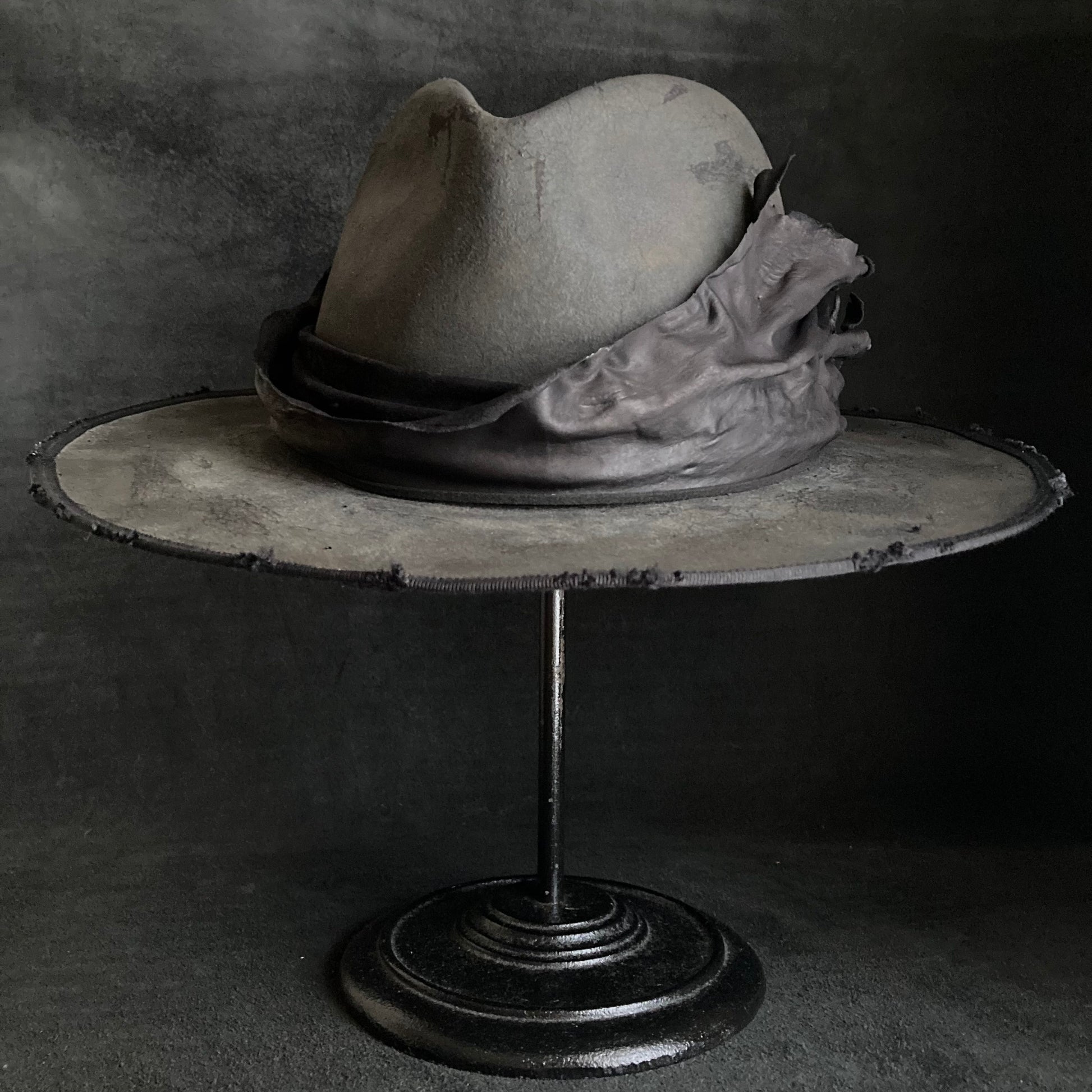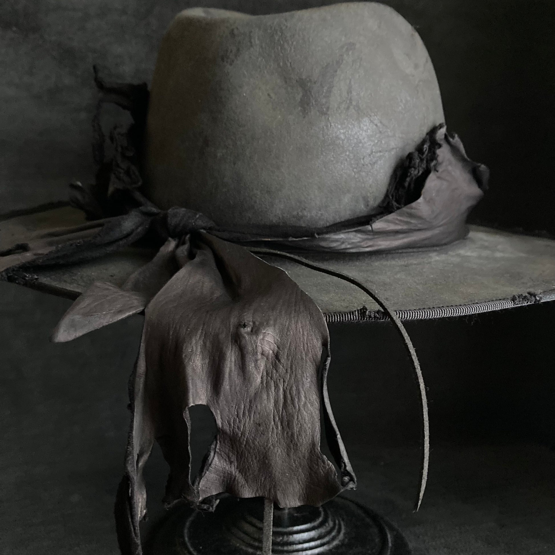 飾りはバック中心で、ブラックのレザーを帽子を覆うように巻いています。