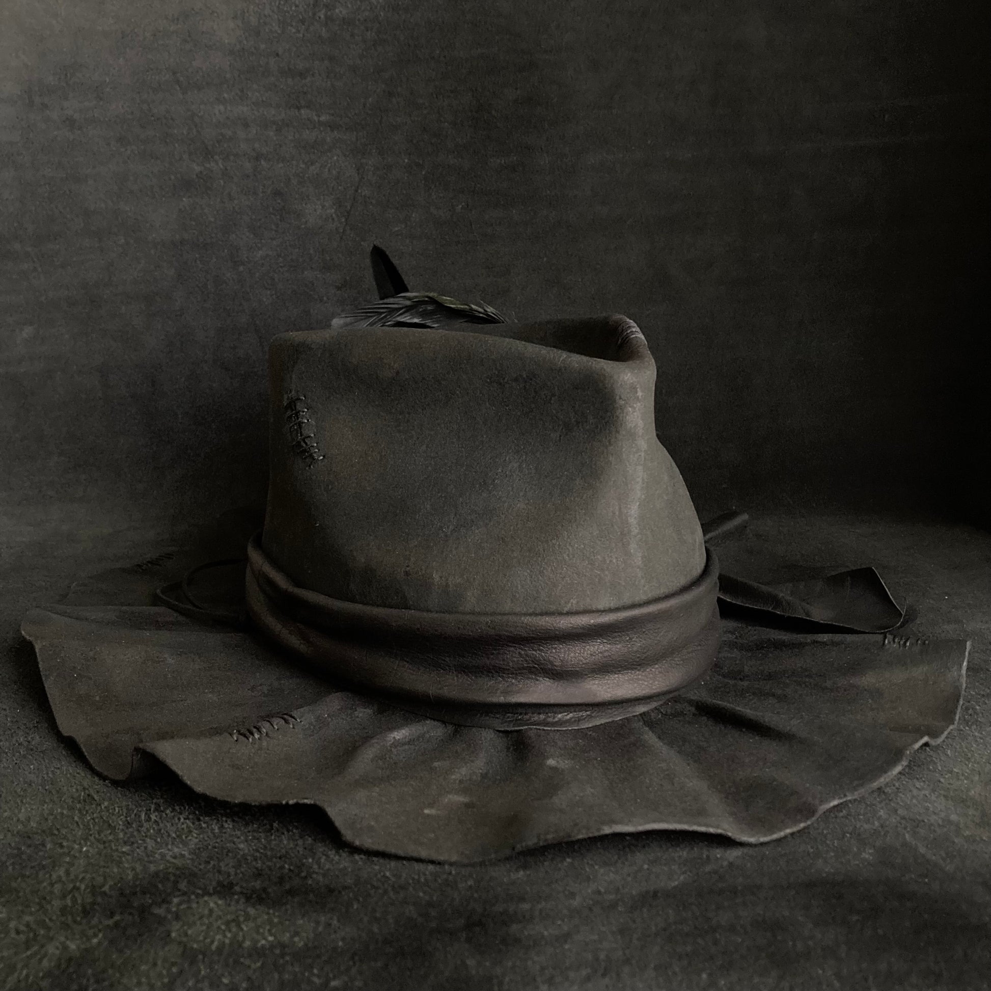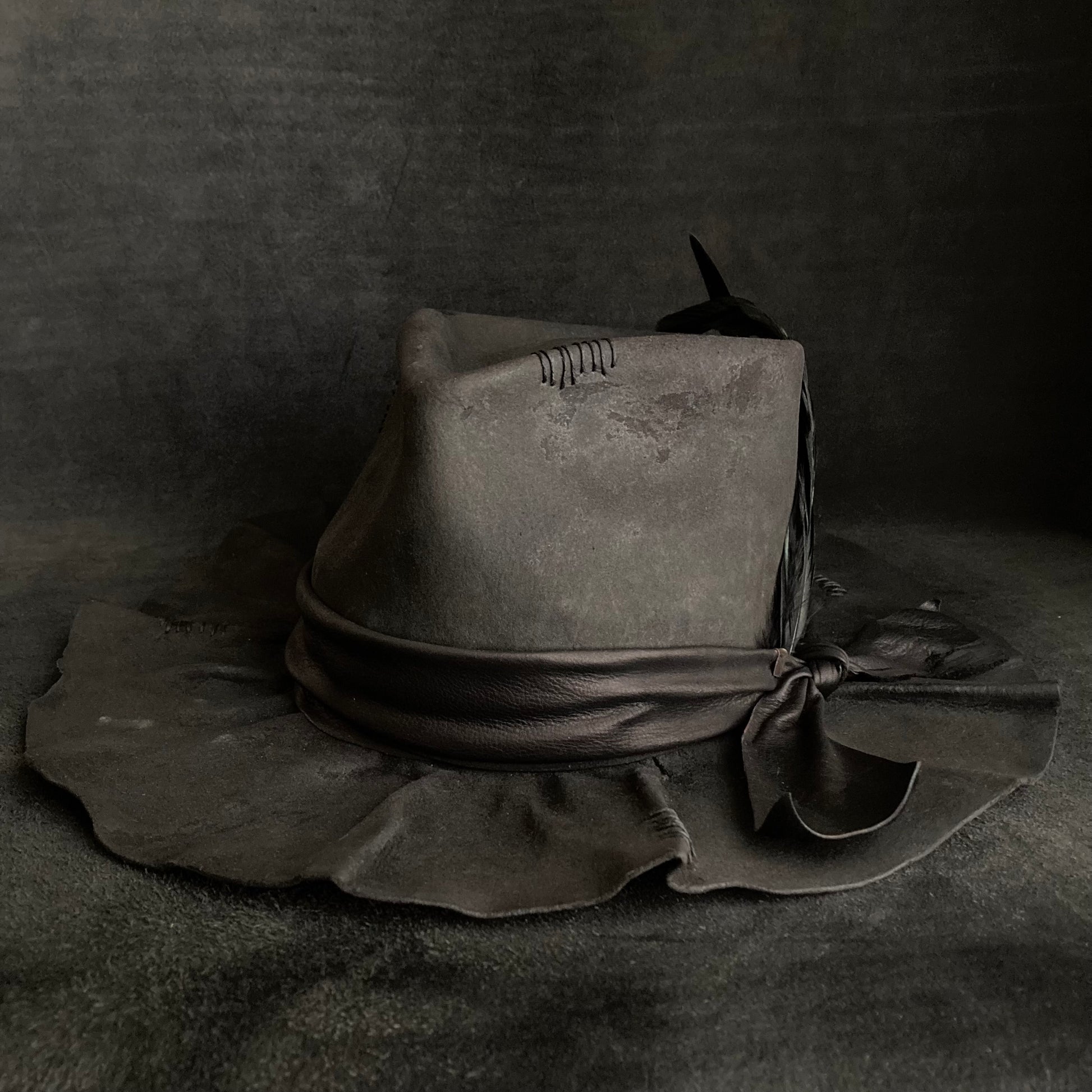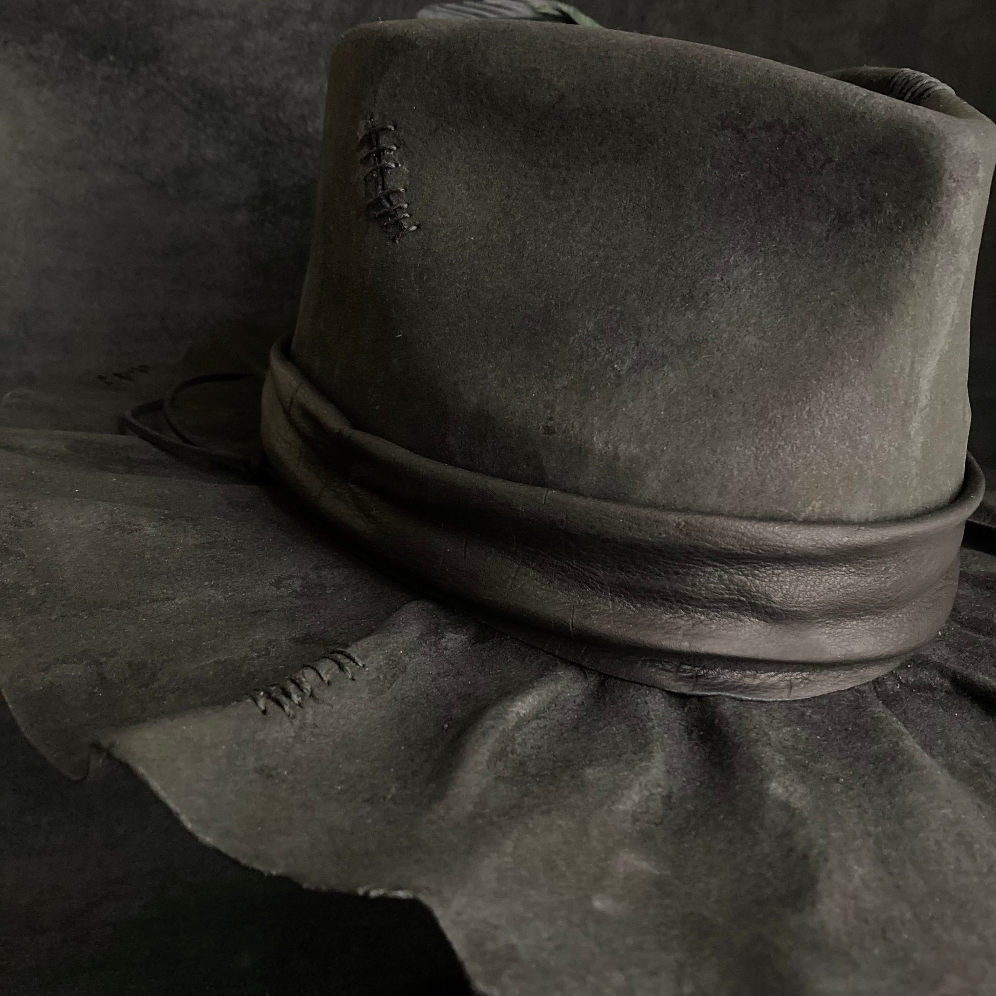 クラウンやブリムにロウ引き糸で飾りステッチを入れています。。