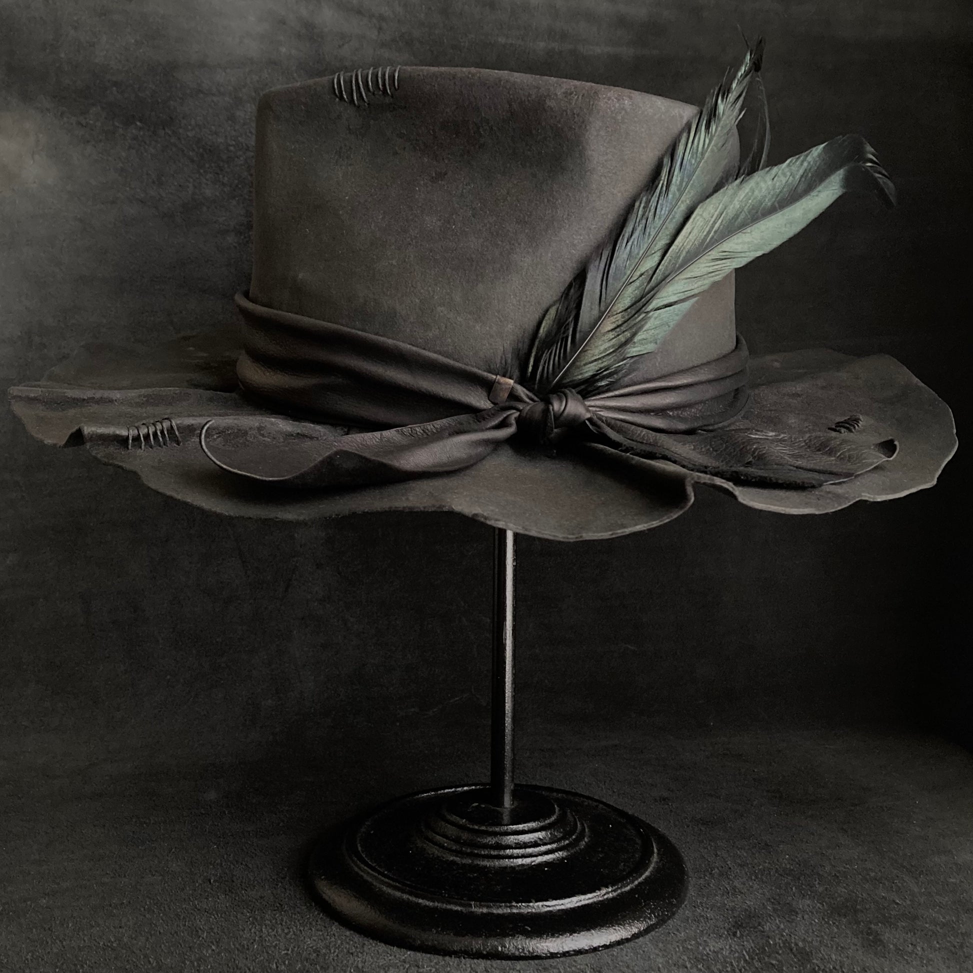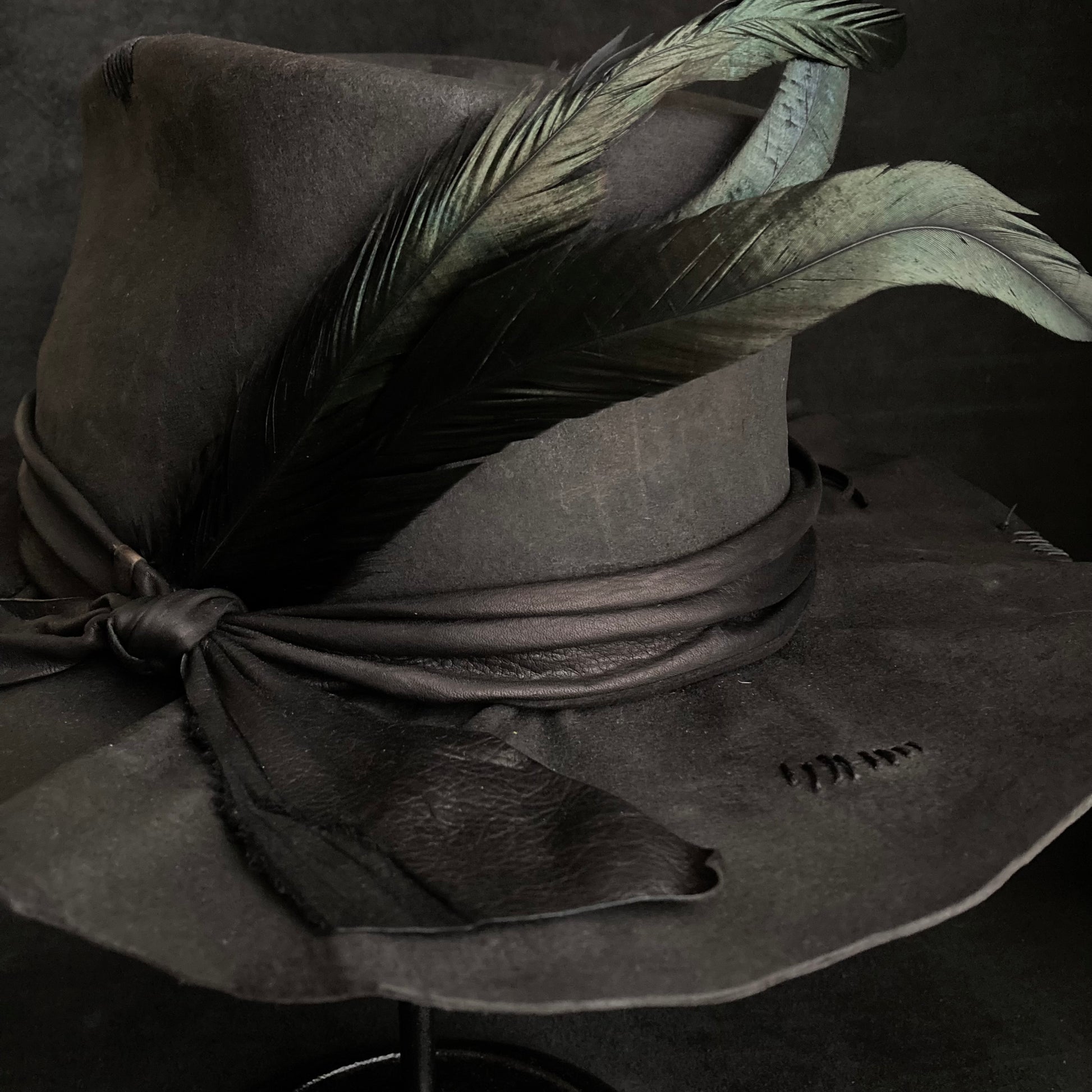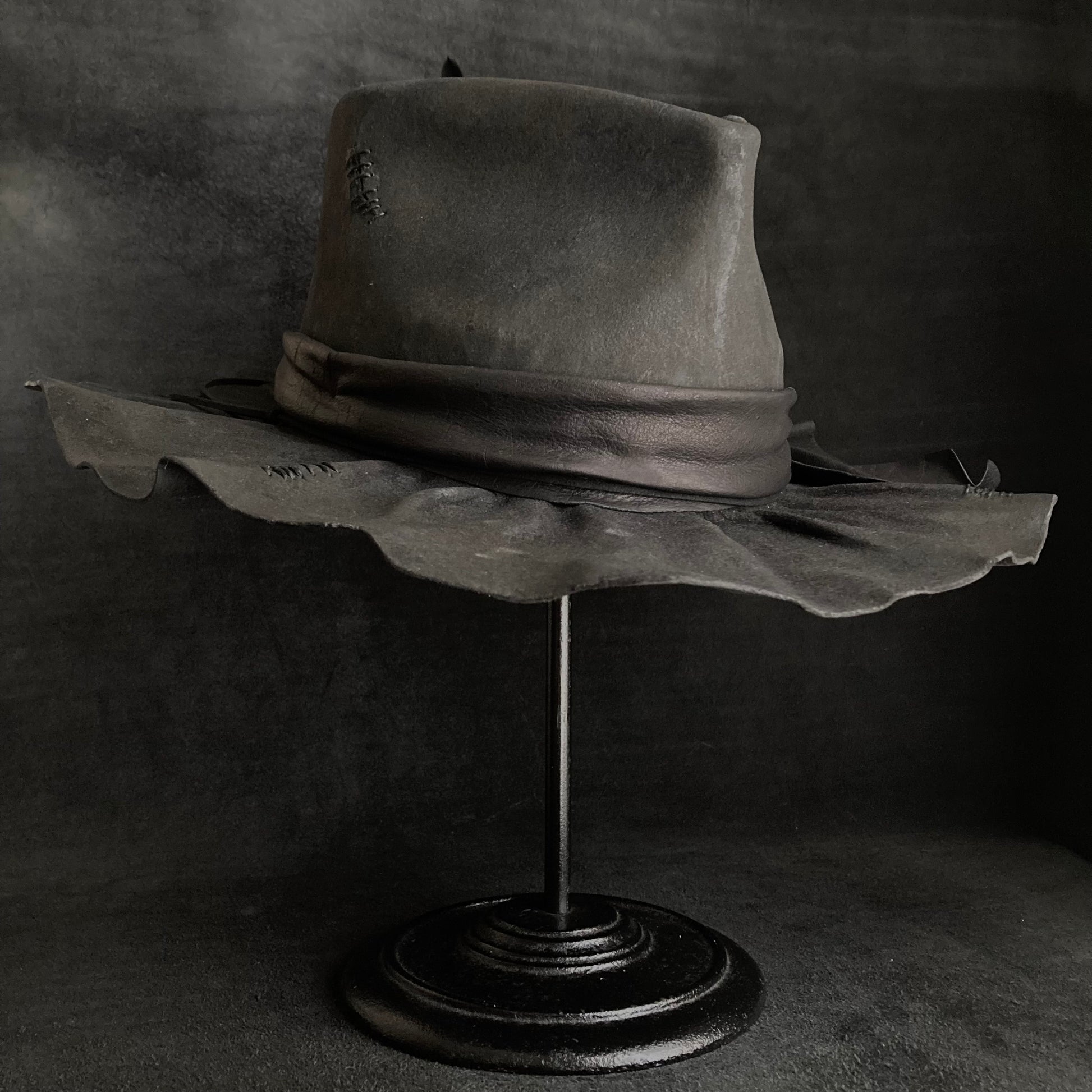 クラウンやブリムにロウ引き糸で飾りステッチを入れています。。