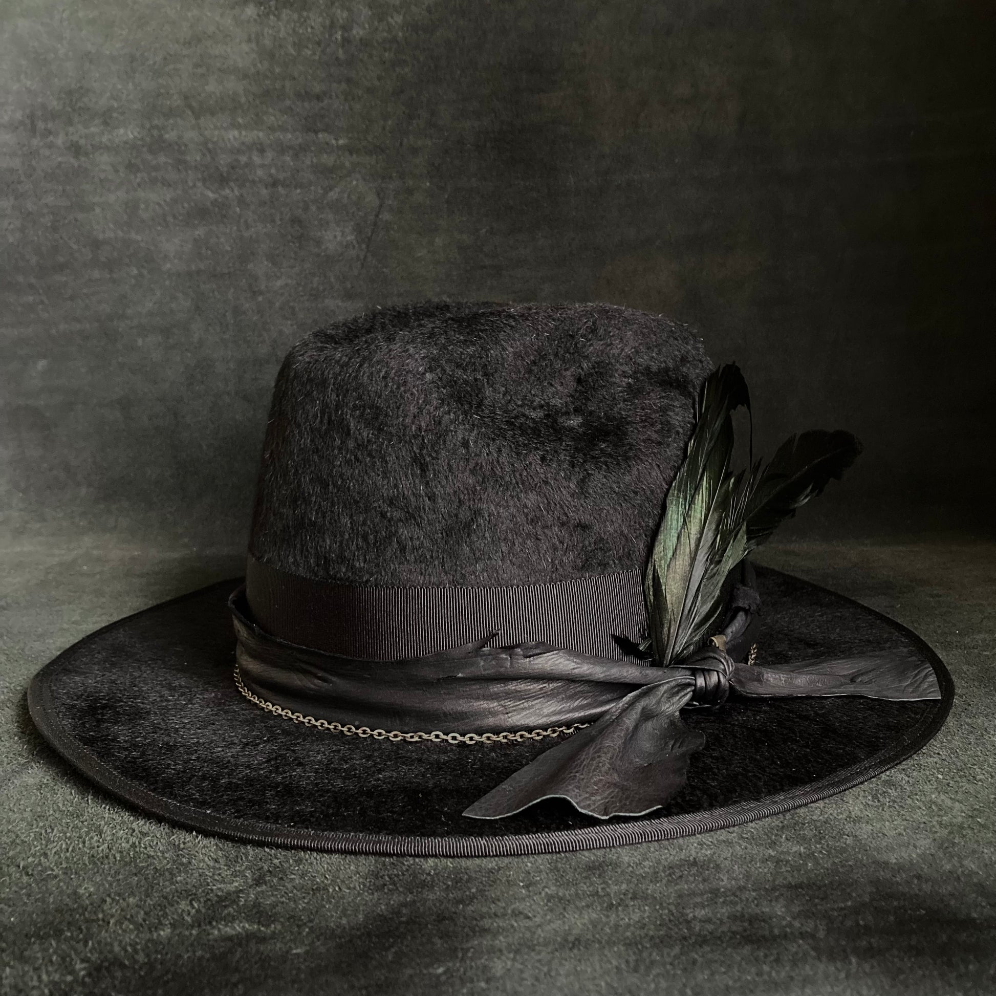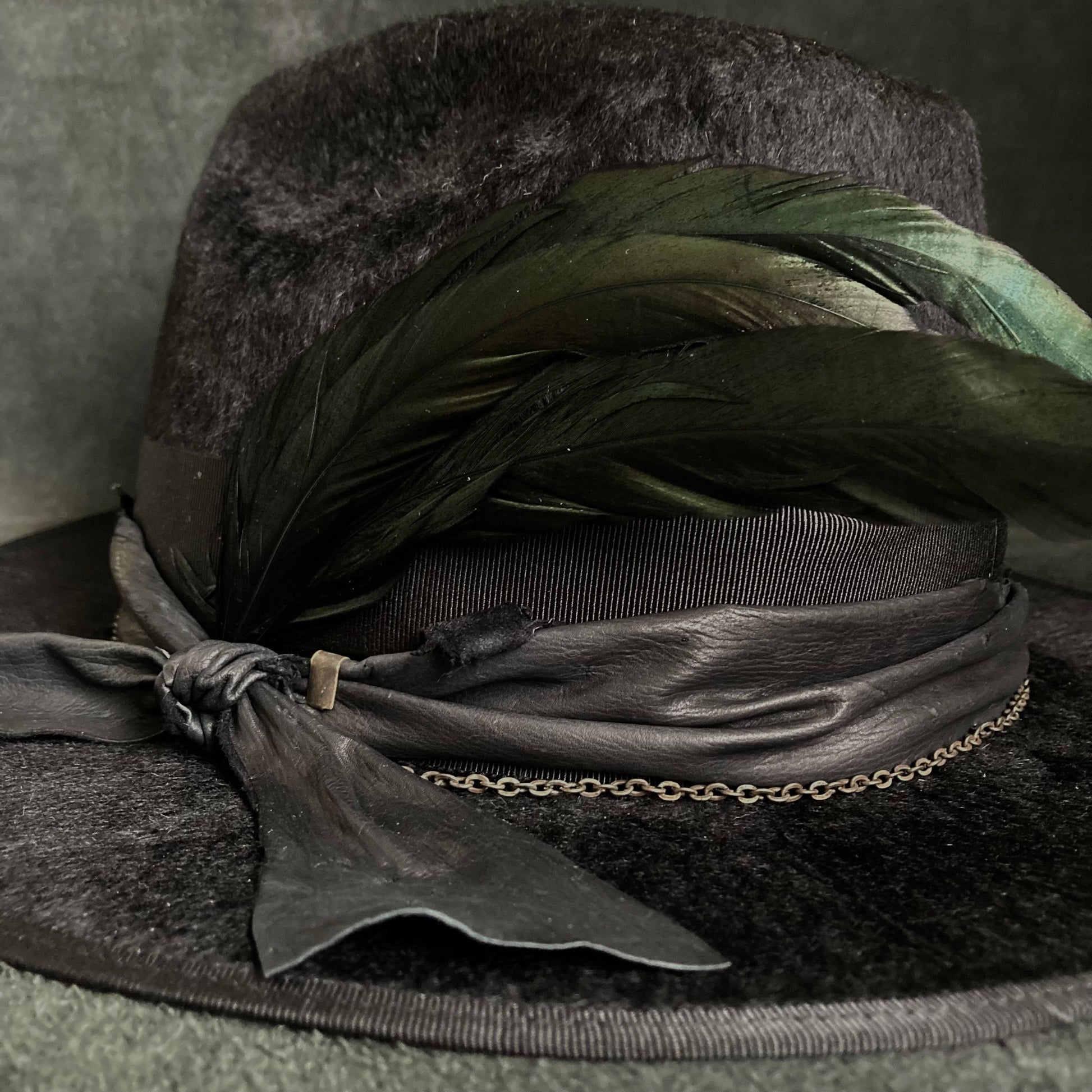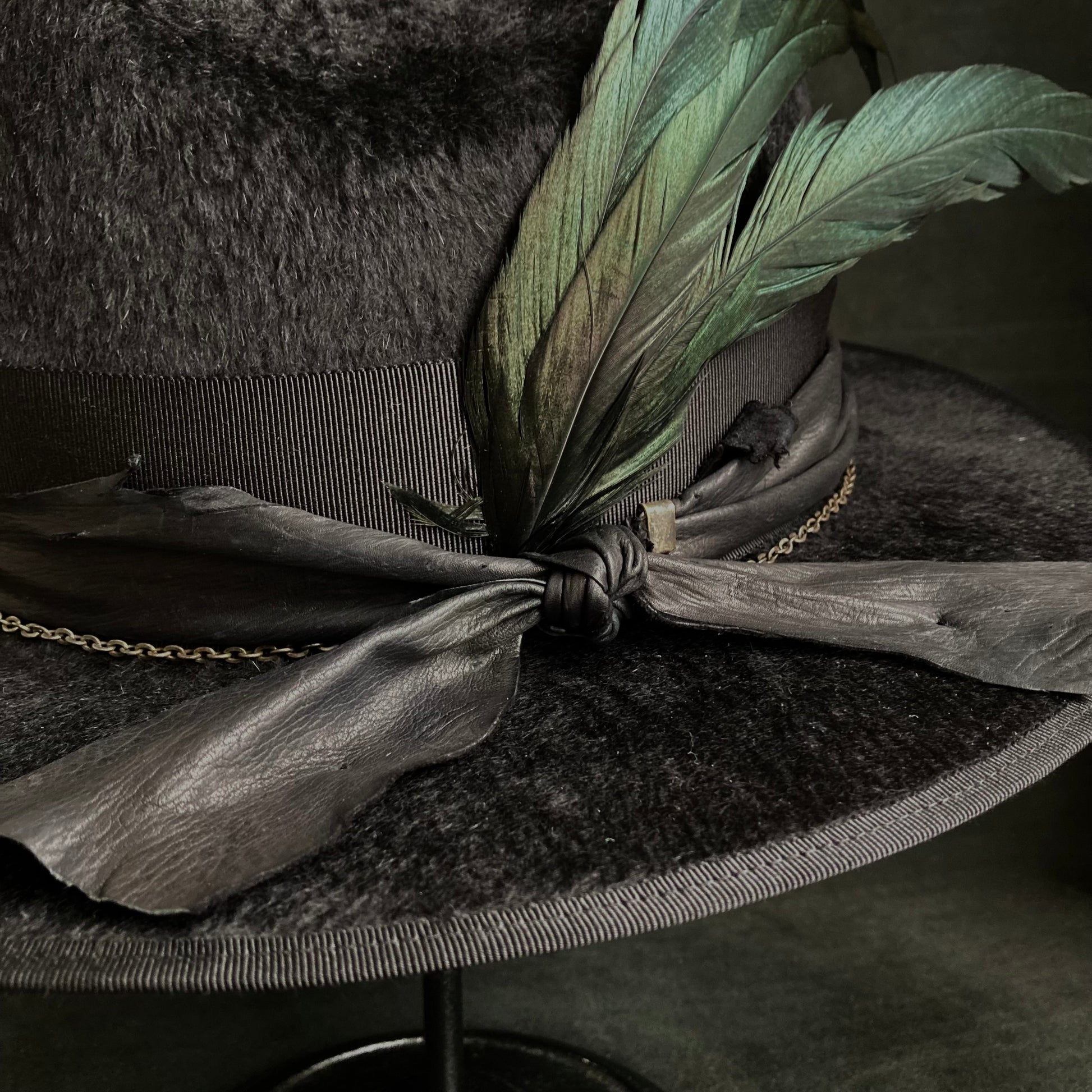 ポイントに、ブラックの羽根をさしています。(光のあたり方により、グリーンのように色味になります)