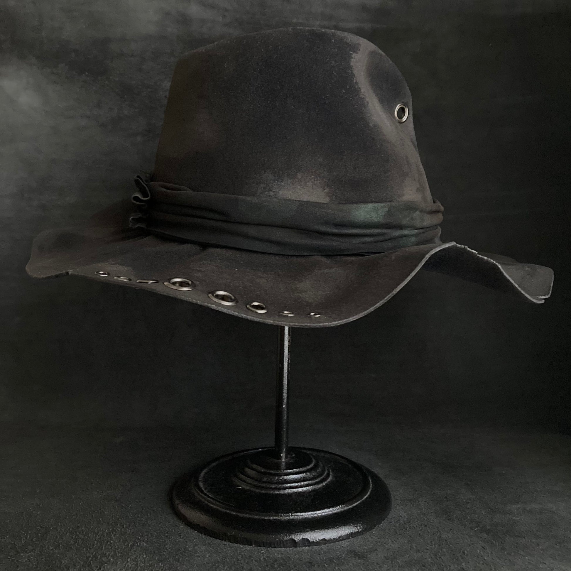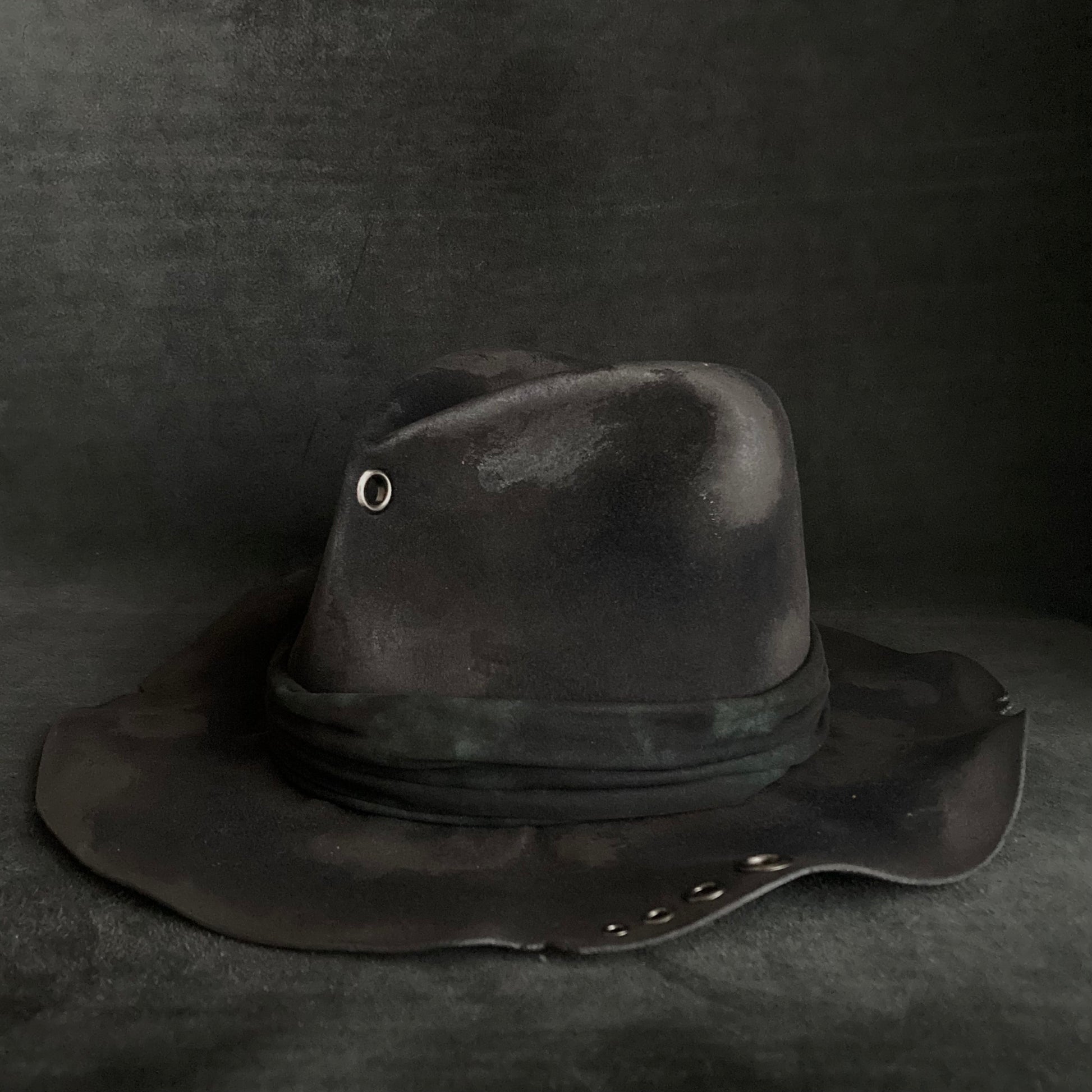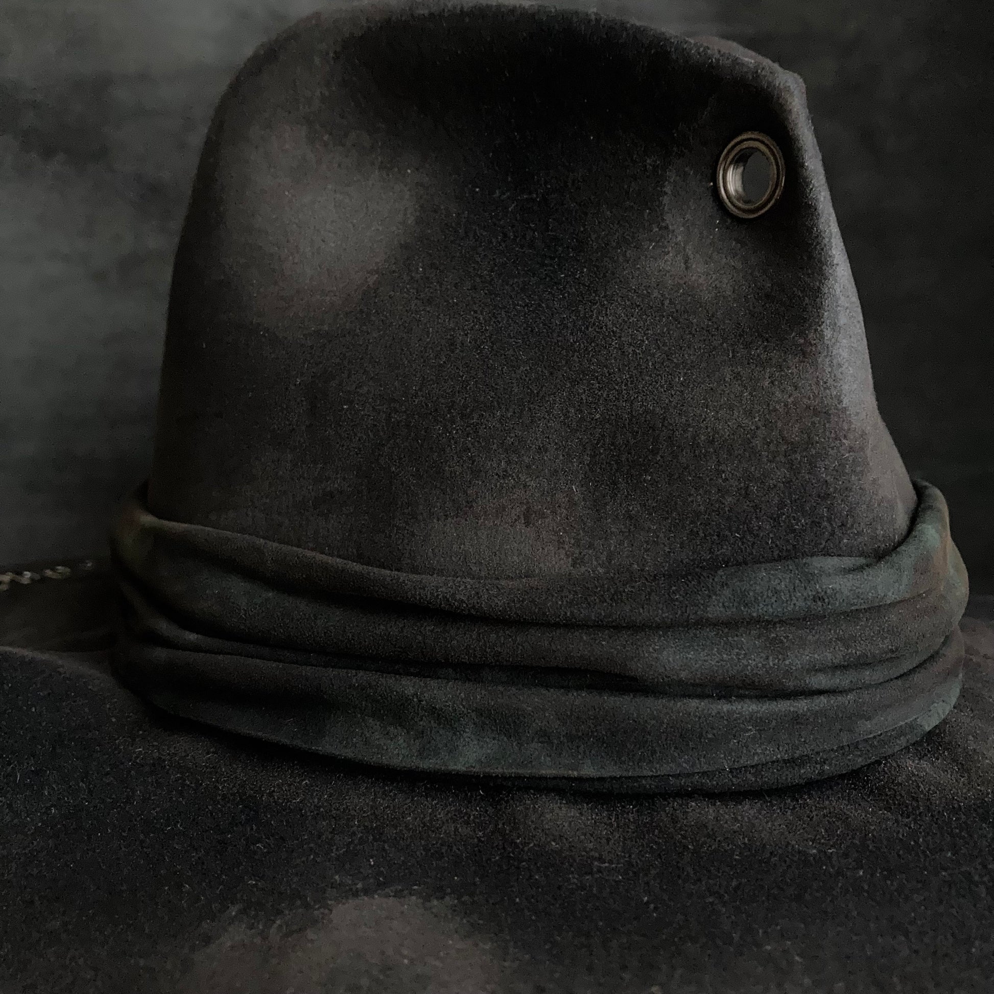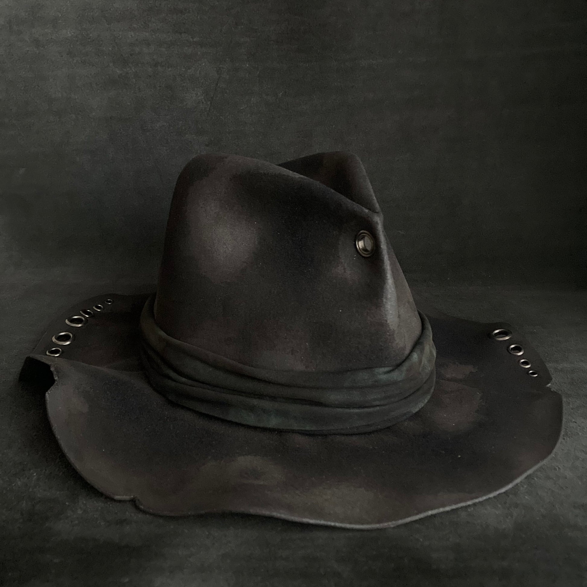 フロントに飾りハトメを付けた高さのある中折れハット。