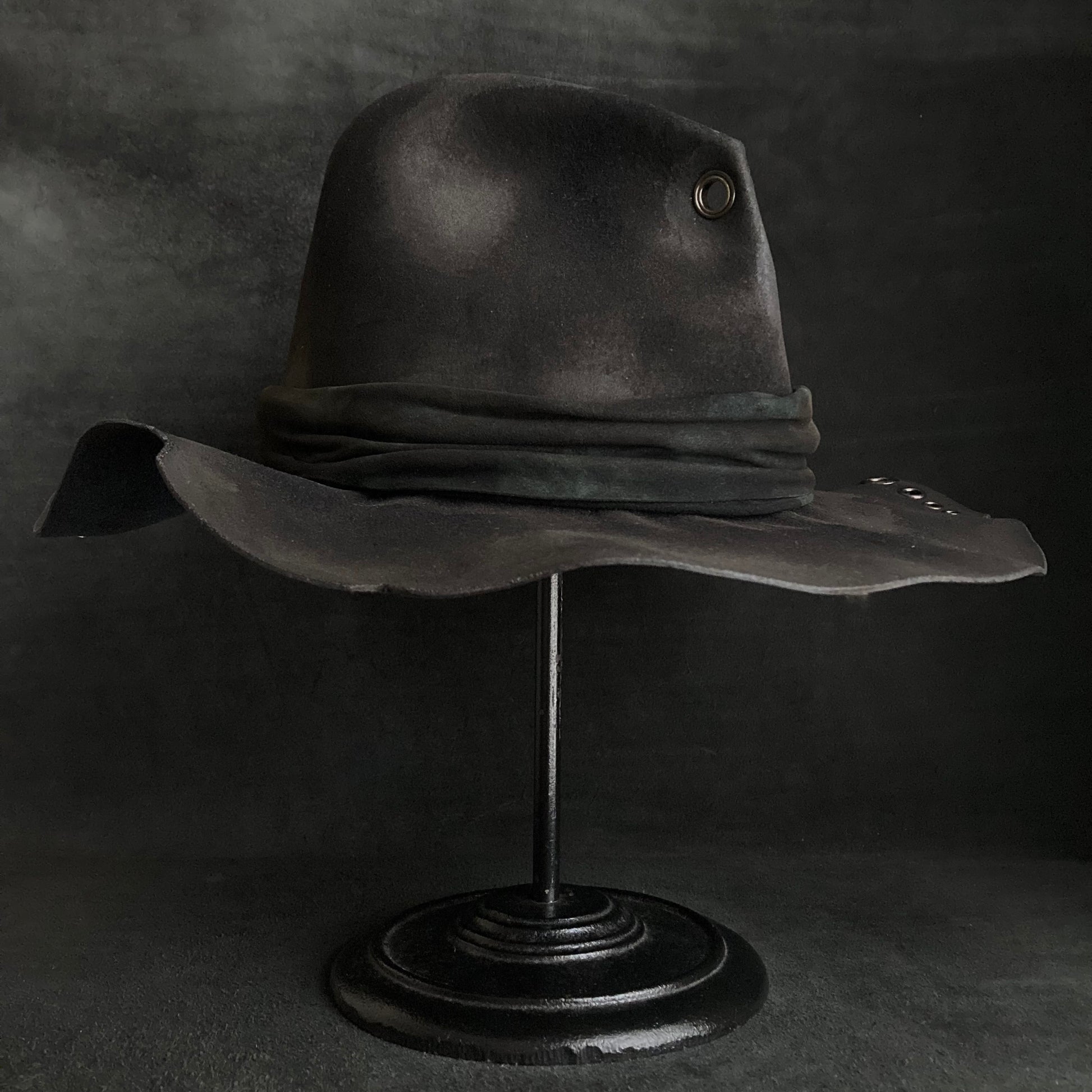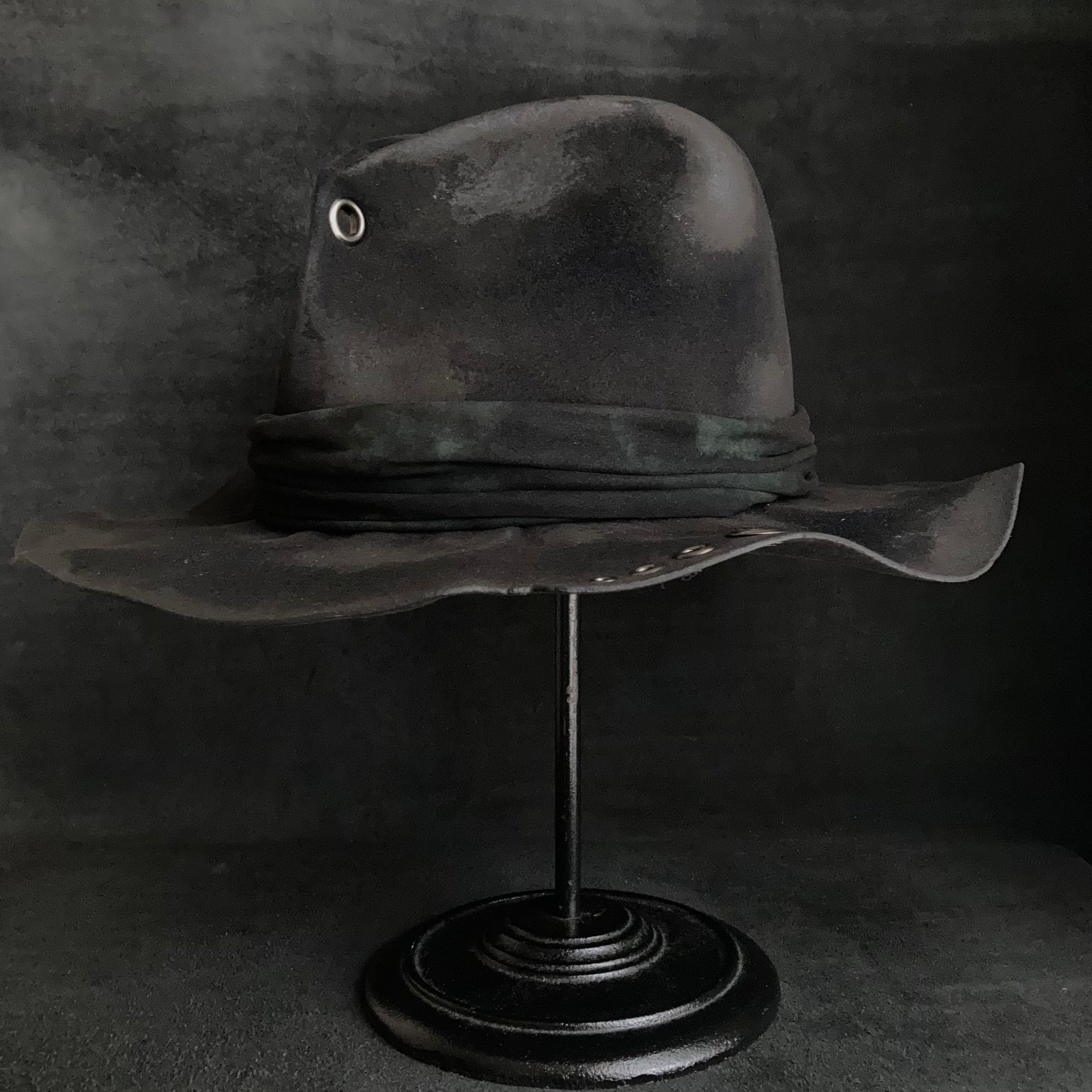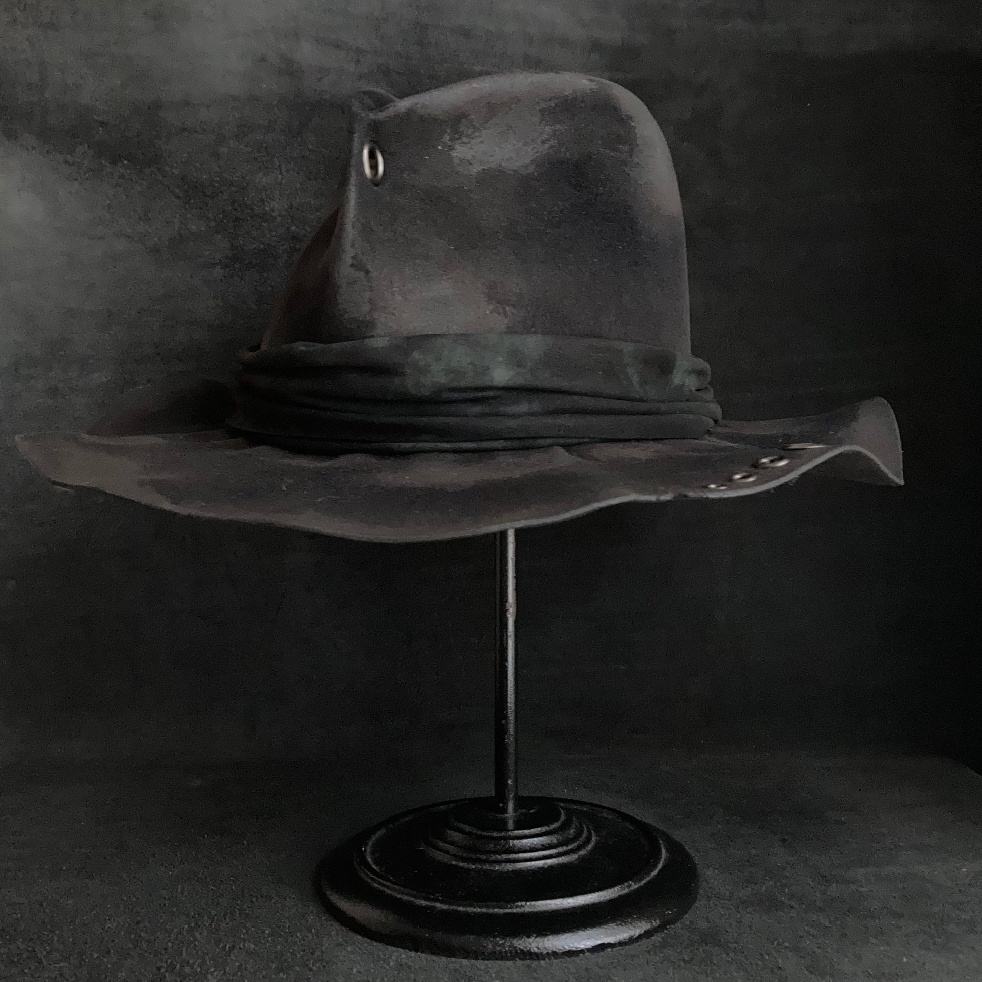 フロントに飾りハトメを付けた高さのある中折れハット。