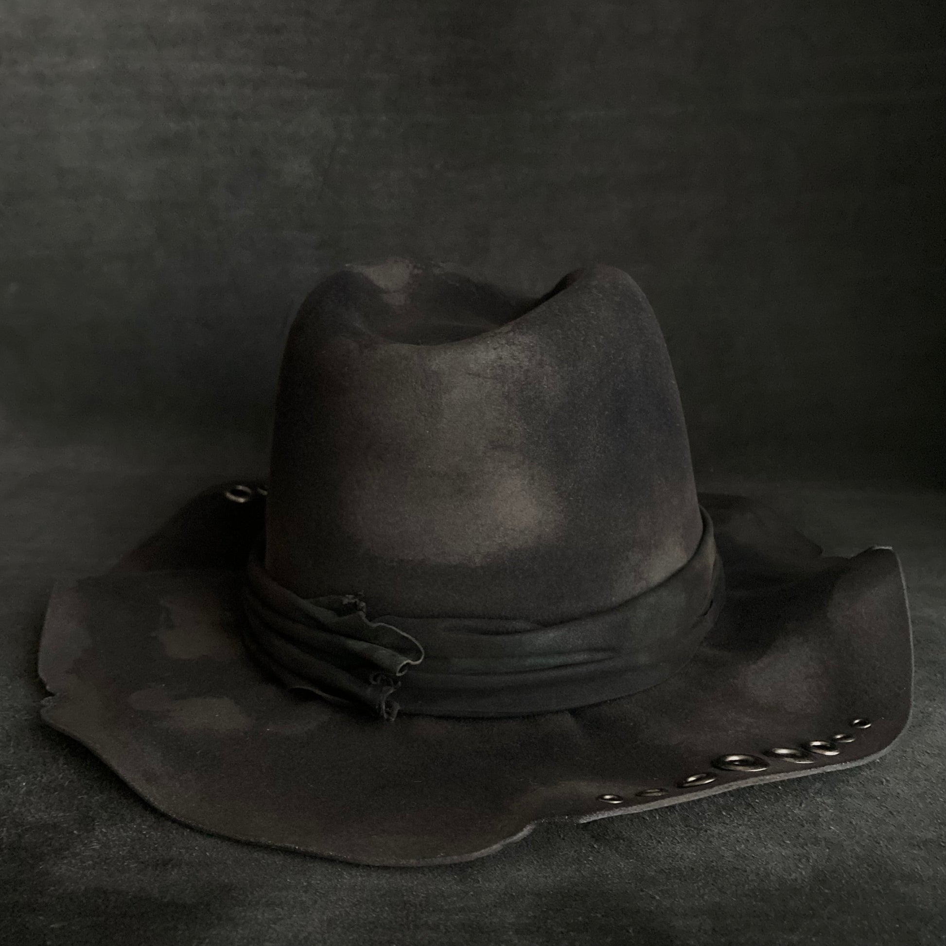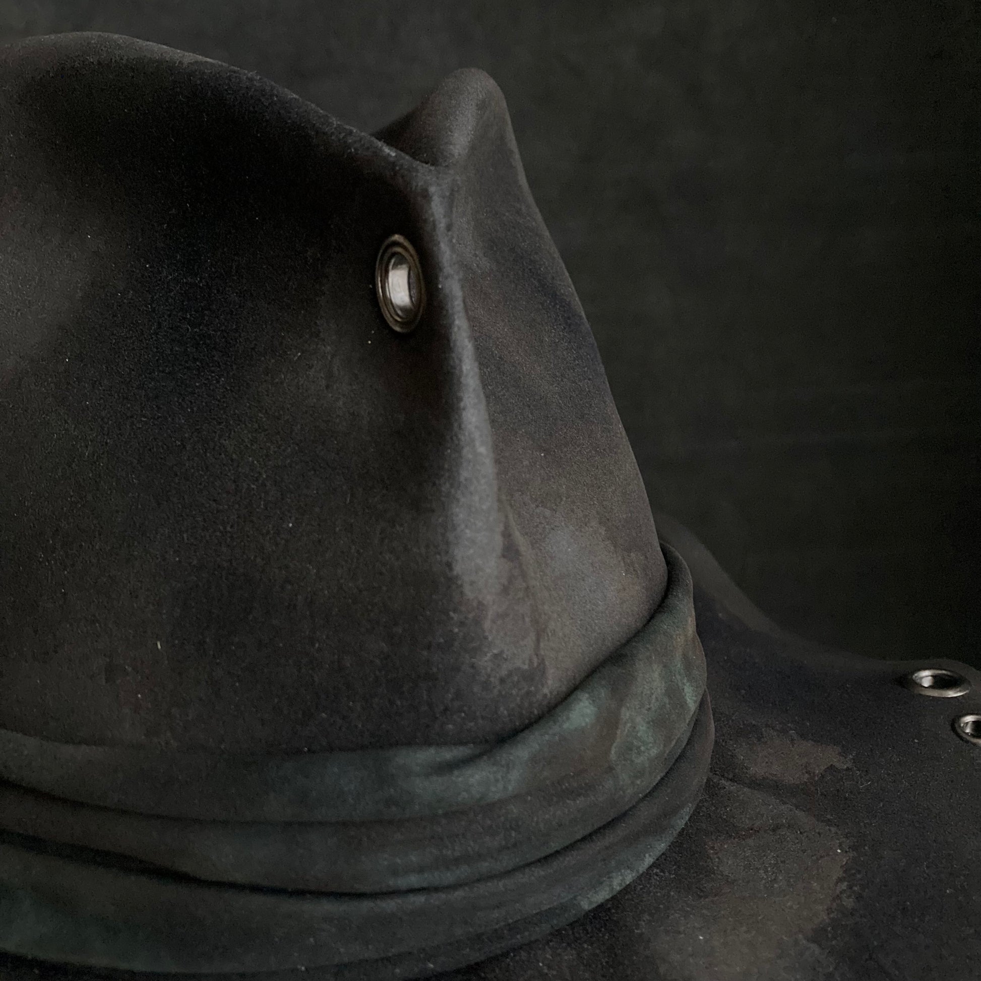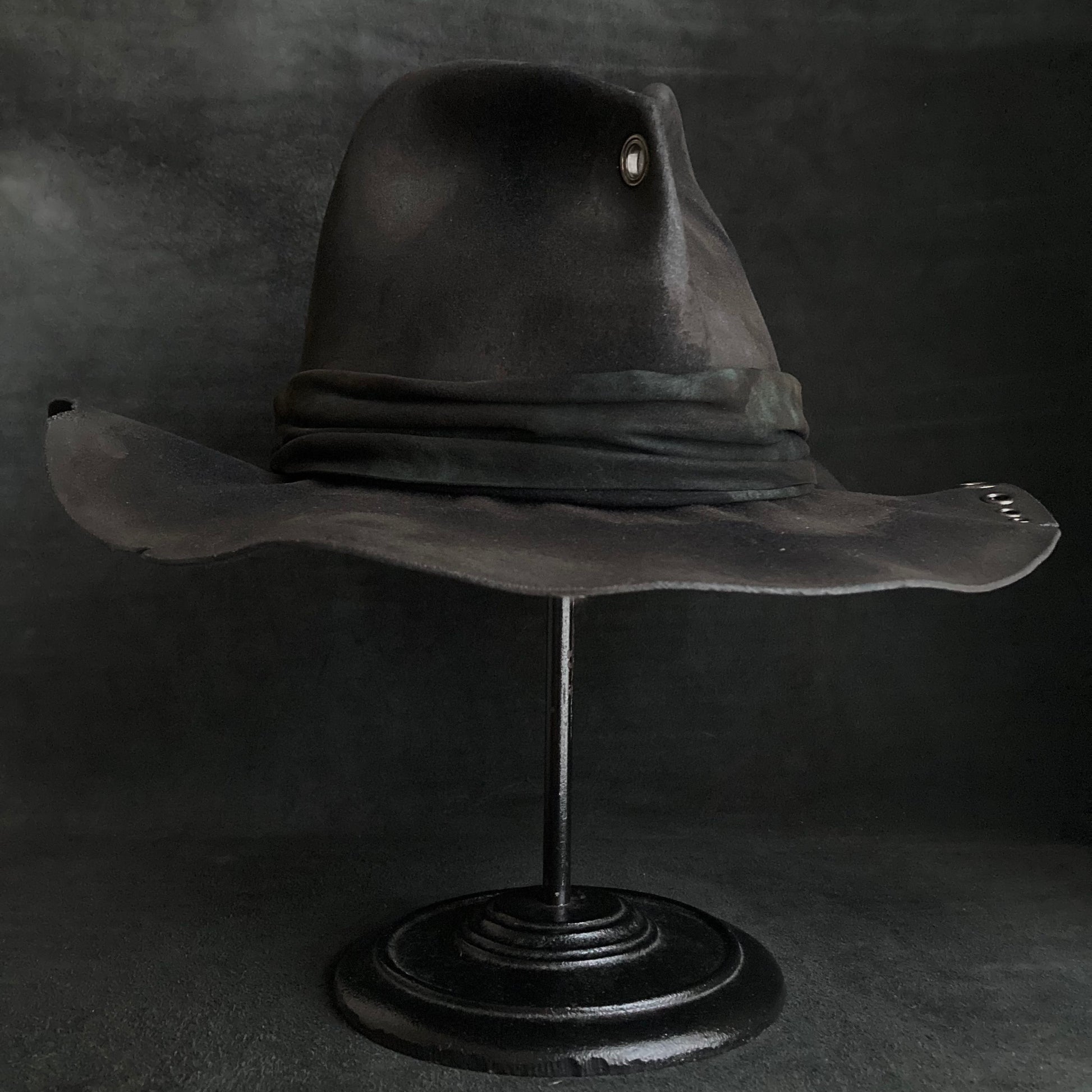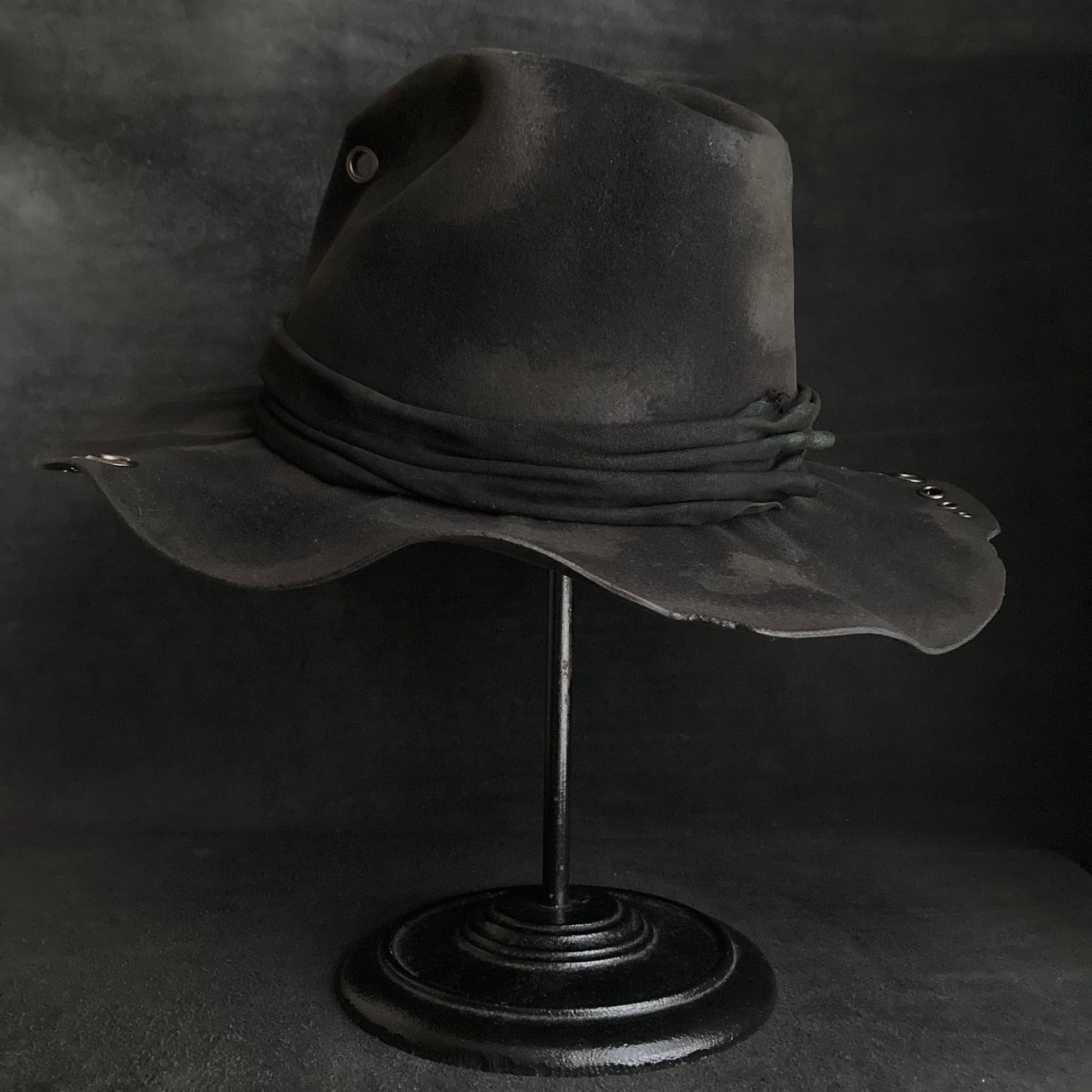 フロントに飾りハトメを付けた高さのある中折れハット。