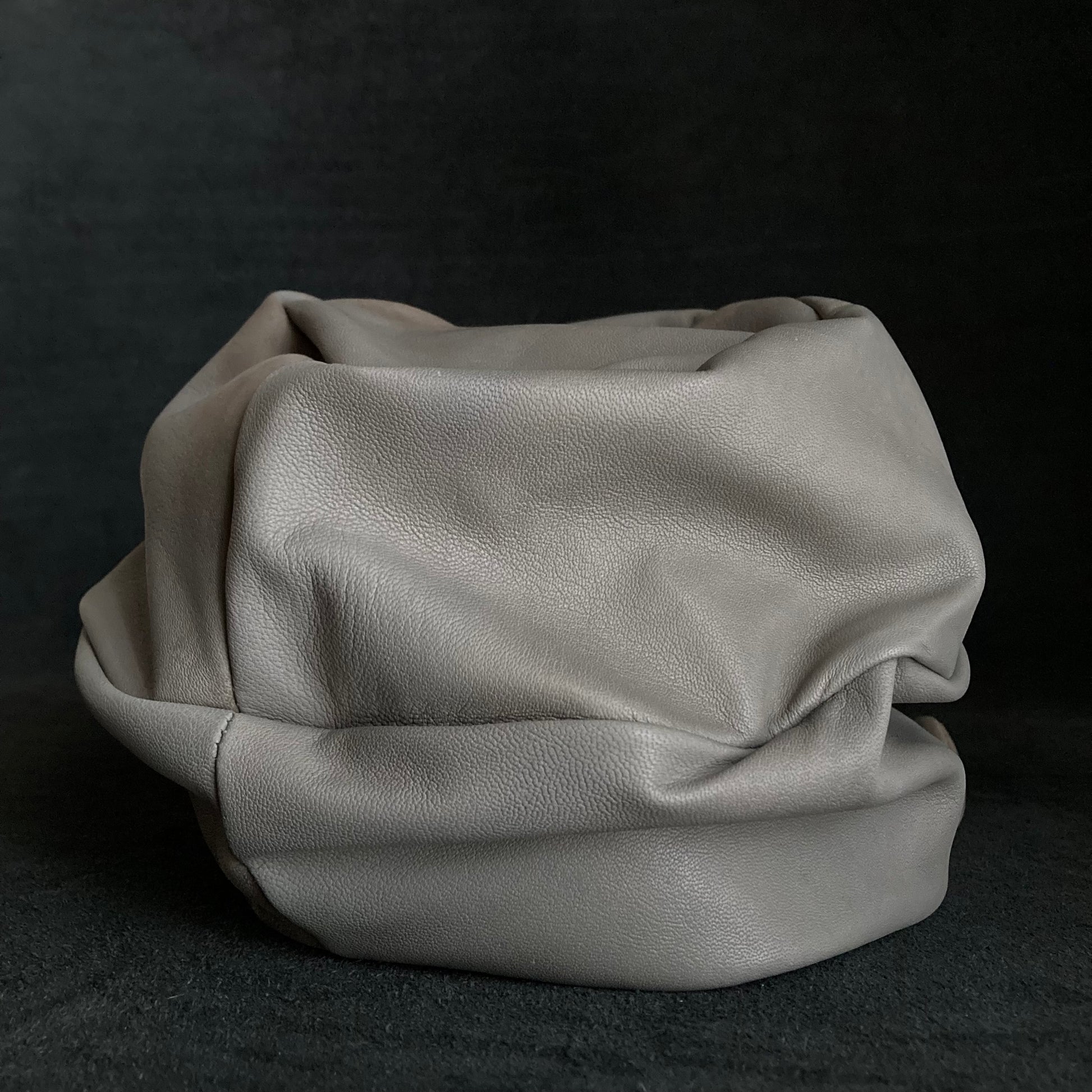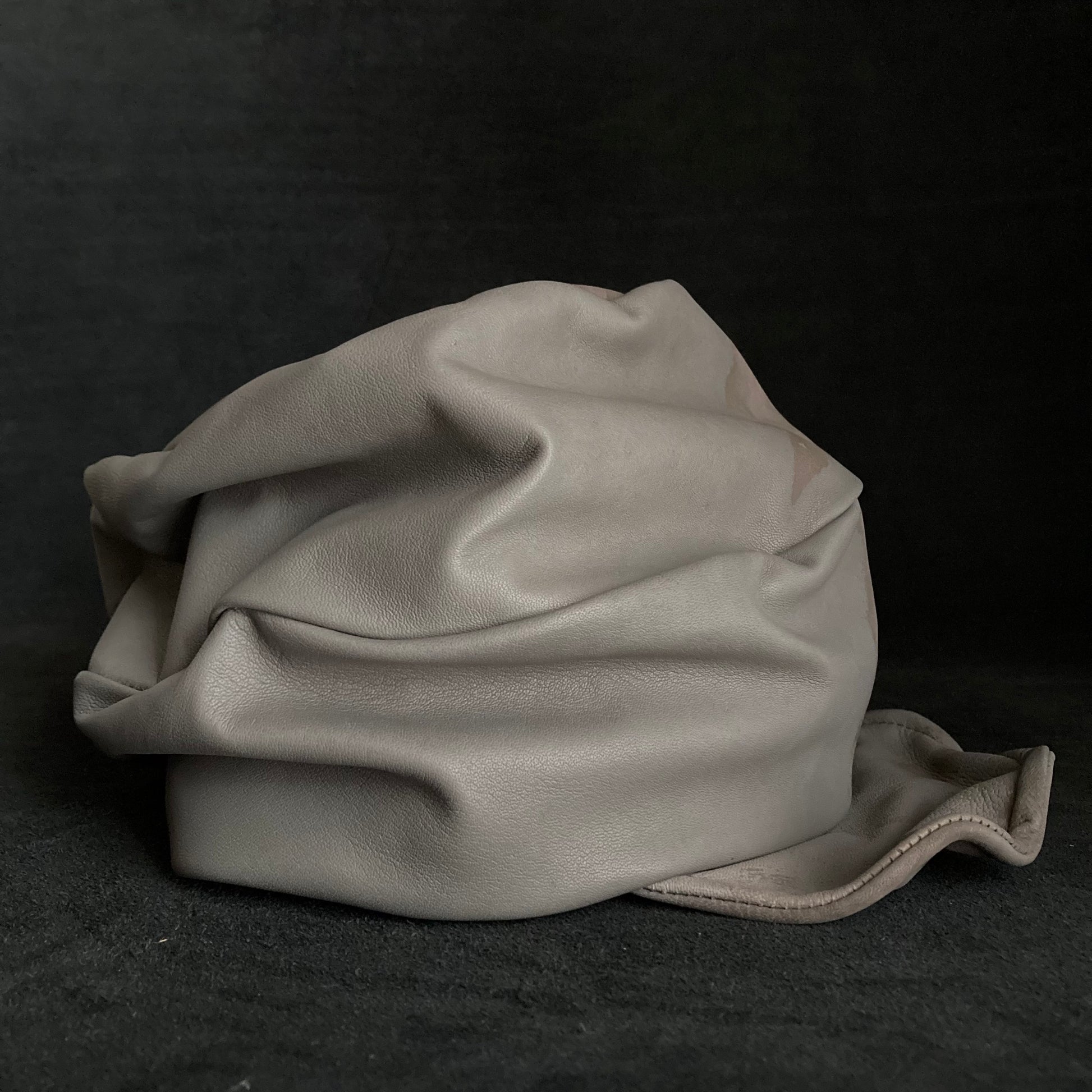 ライトグレーのレザーを使用したキャップ。