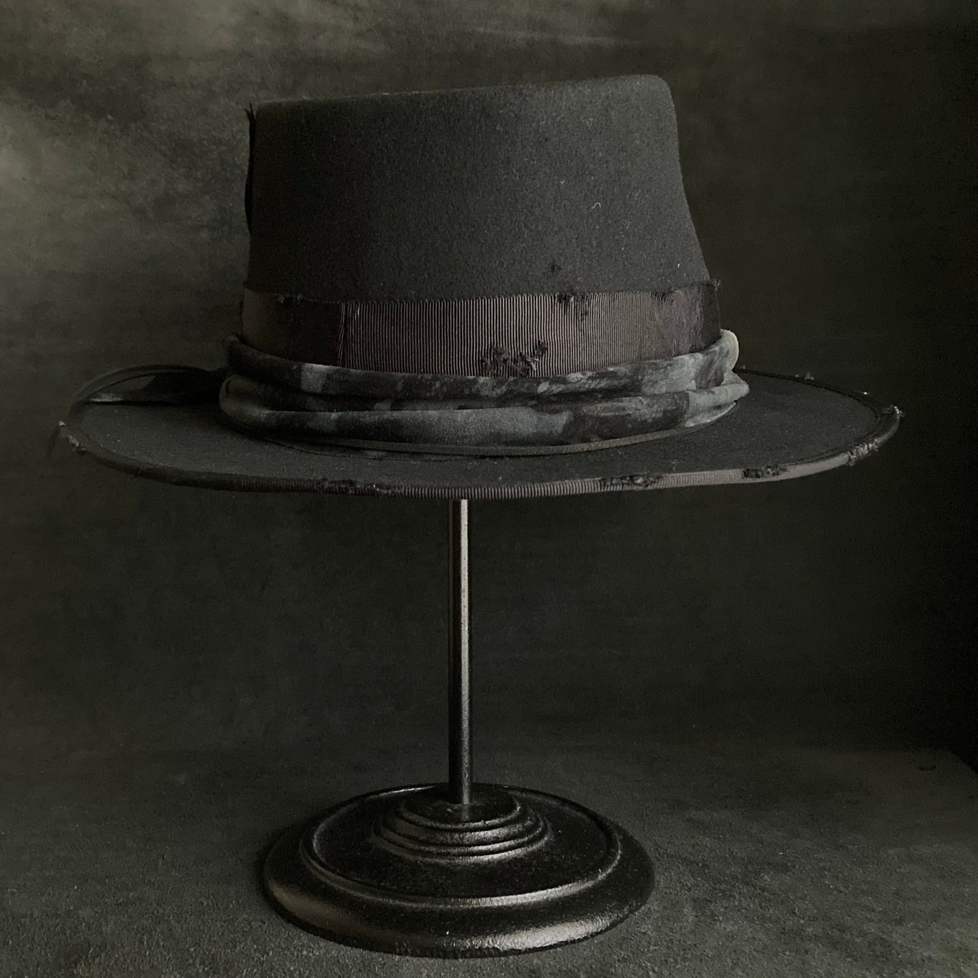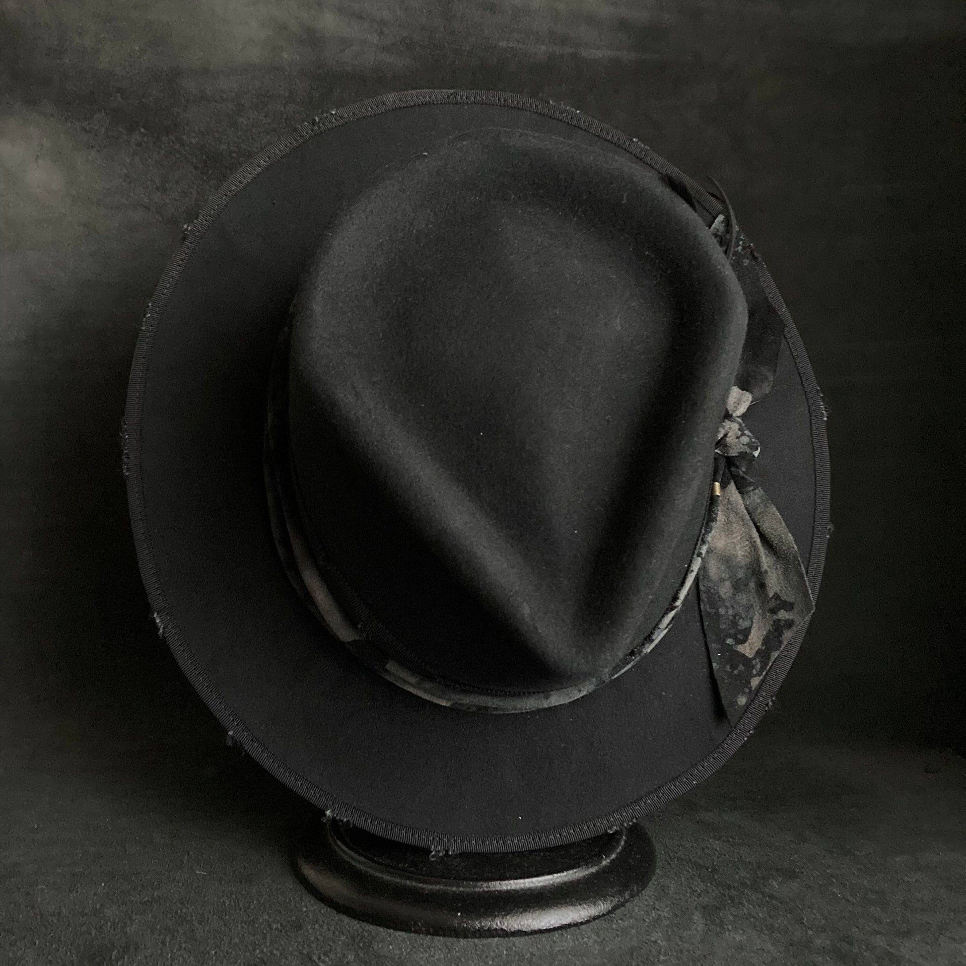 ブリムはダメージ加工したグログランリボンで、パイピング仕上げにしています。