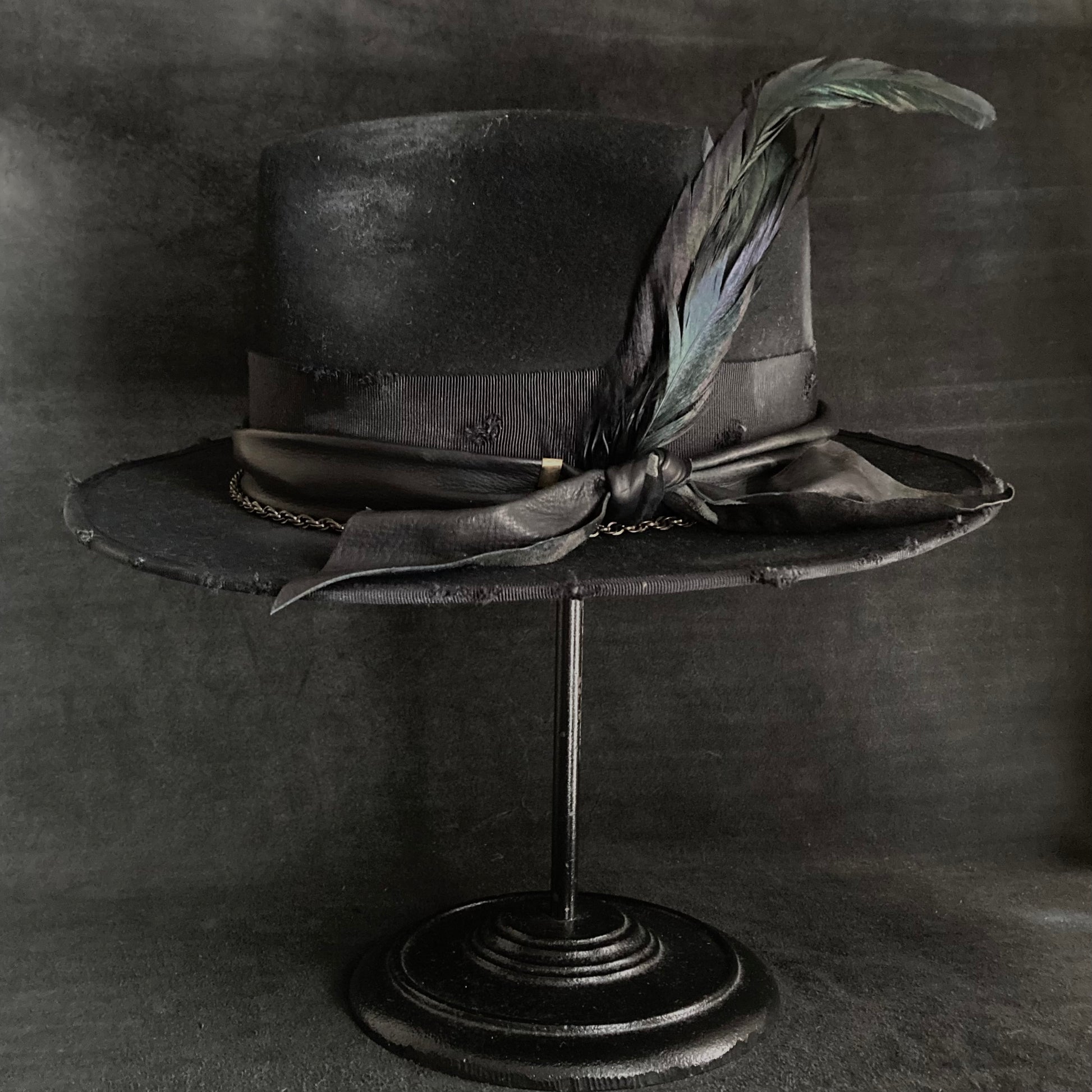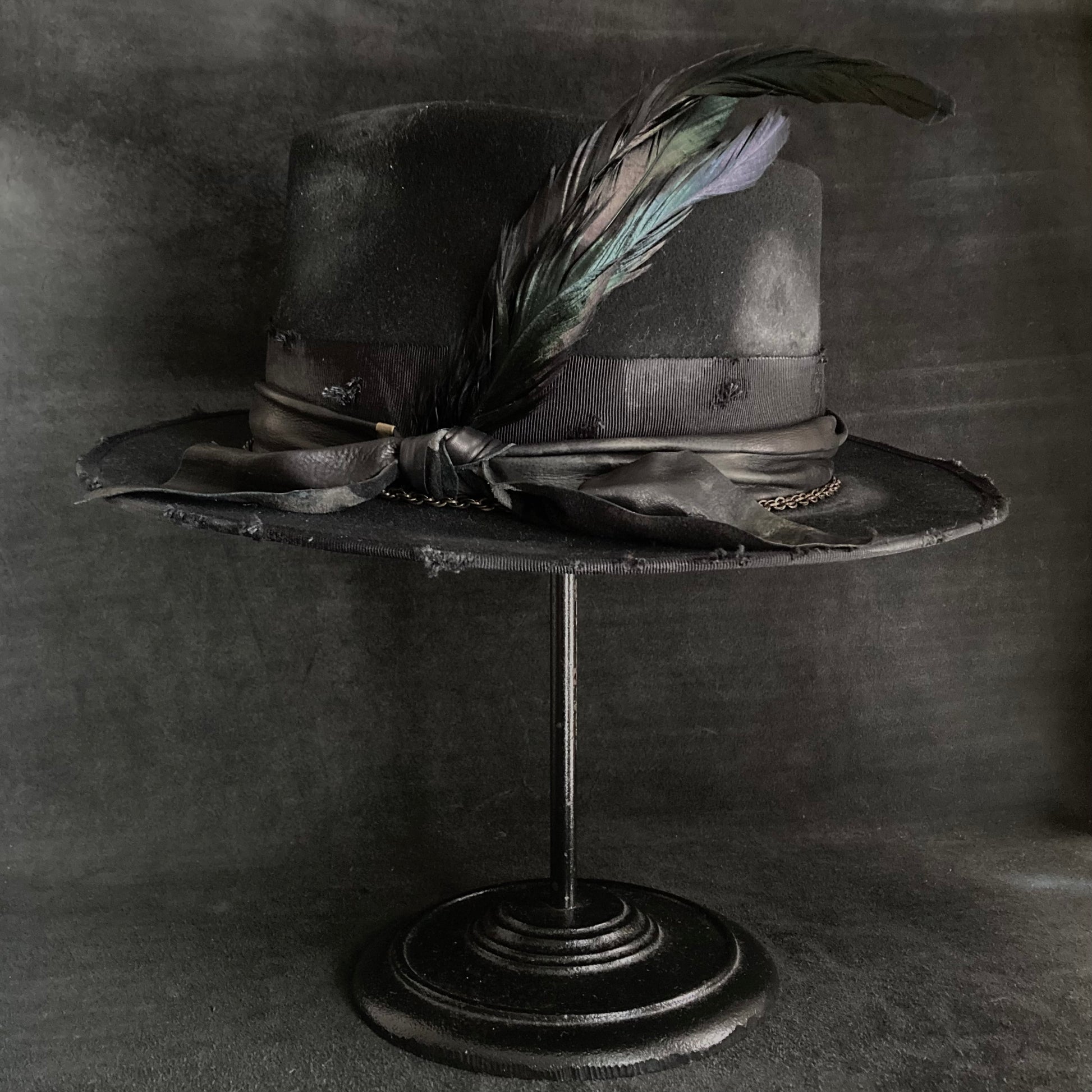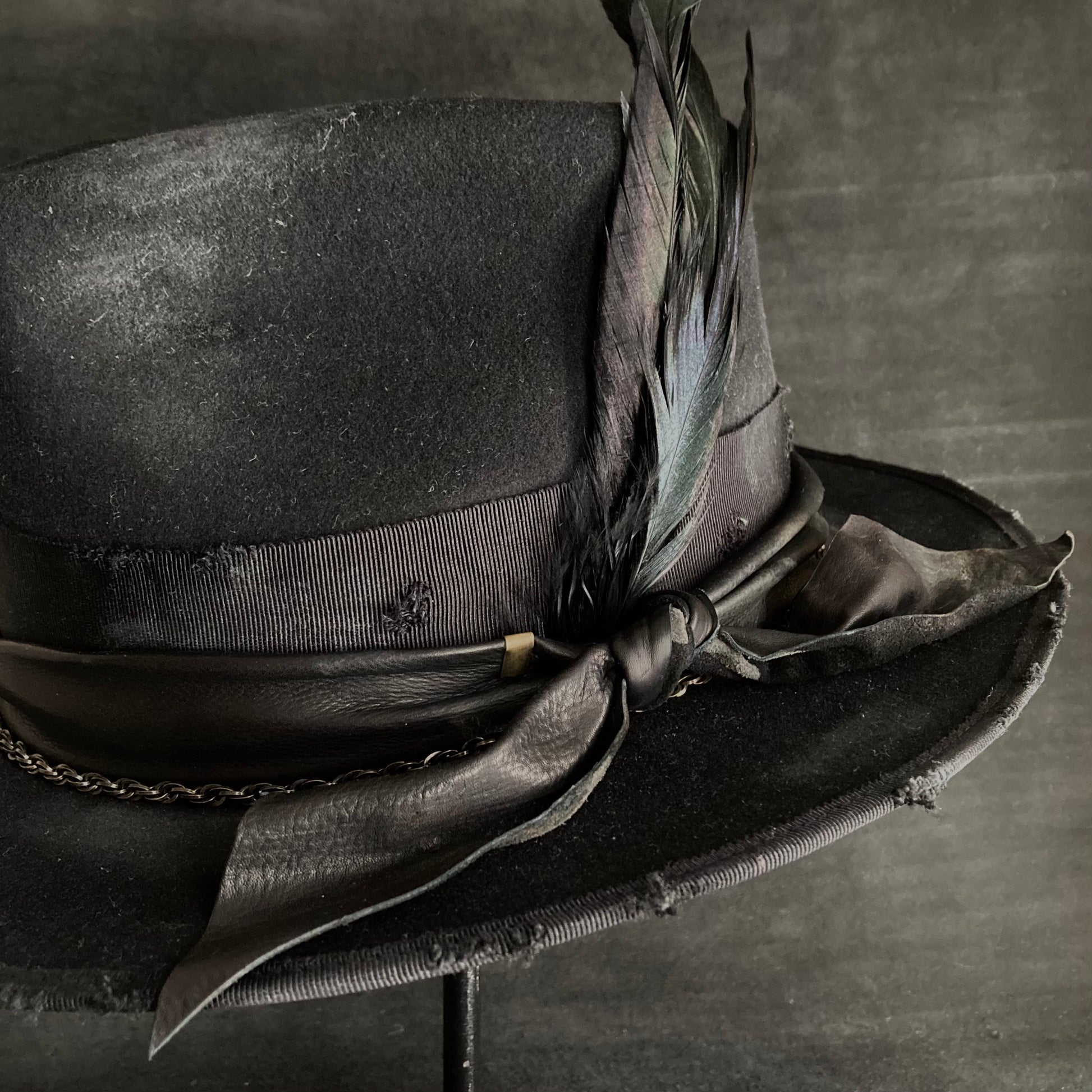 飾りには、レザーとグログランリボン、アンティークゴールドのチェーンを使用しました。ポイントに羽根をさしています。