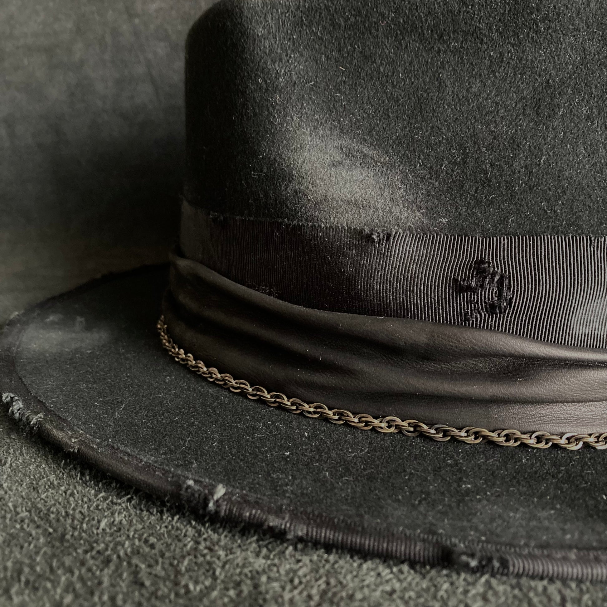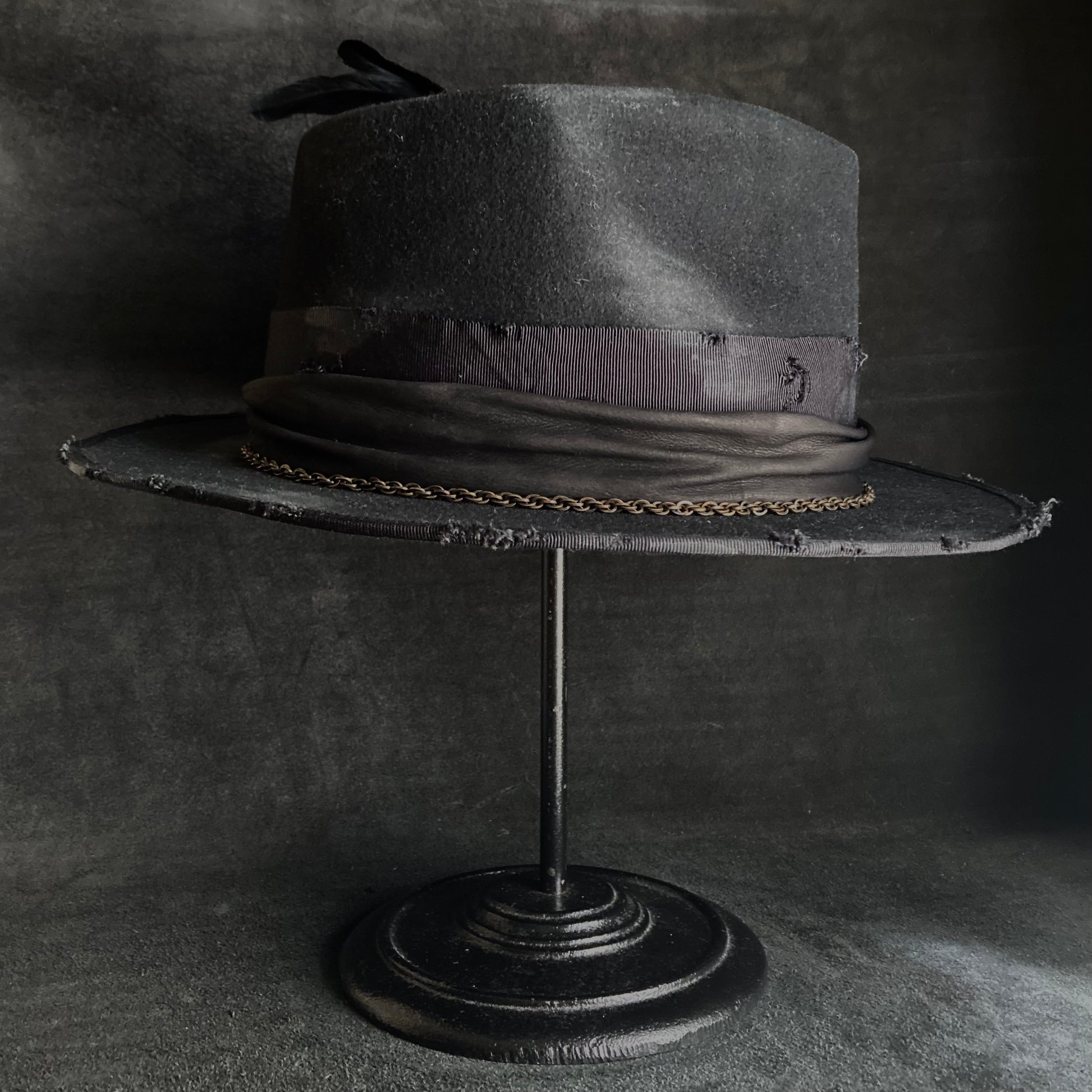 ブリムはダメージ加工したグログランリボンで、パイピング仕上げにしています。