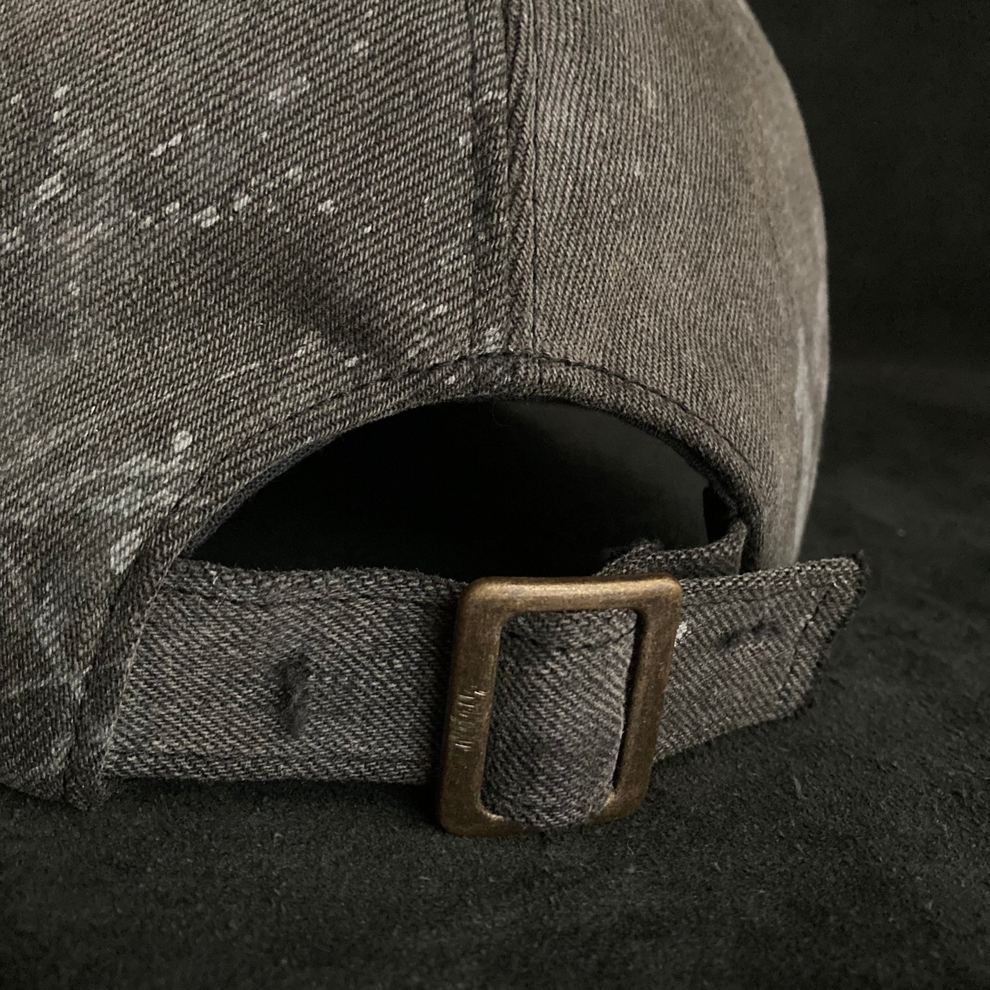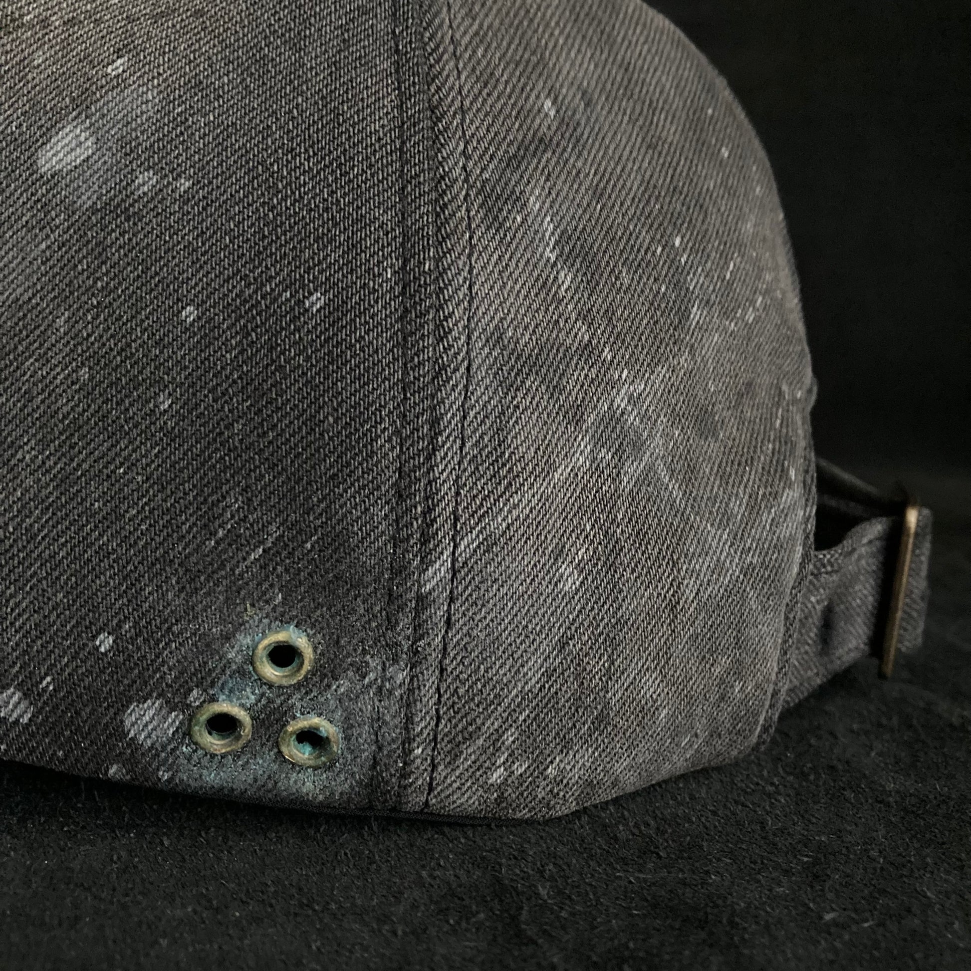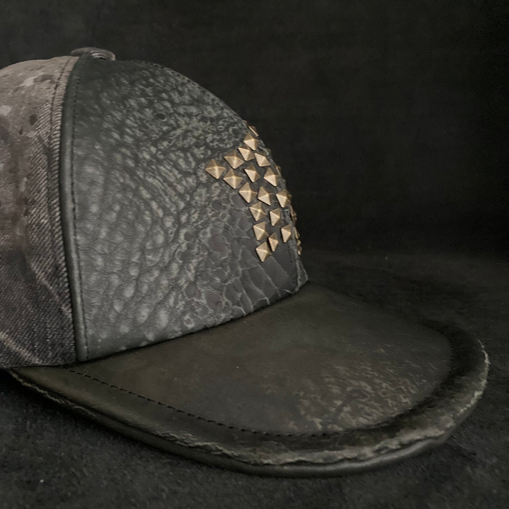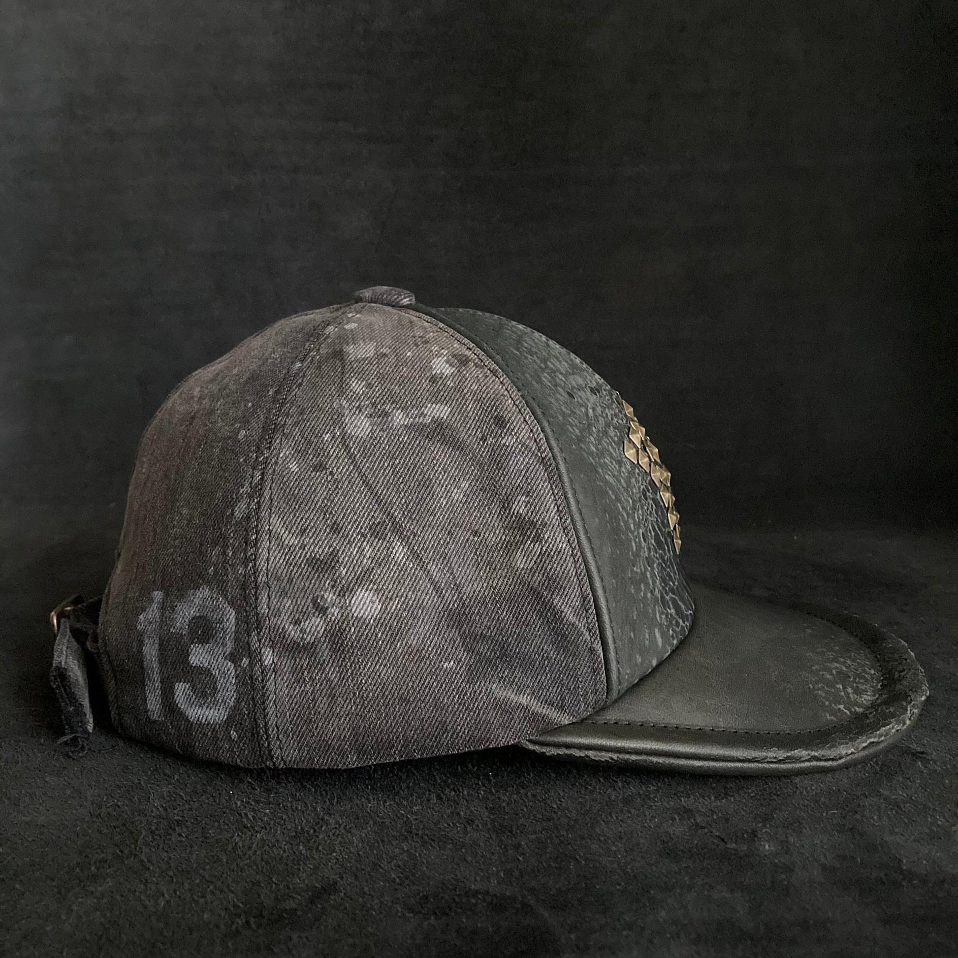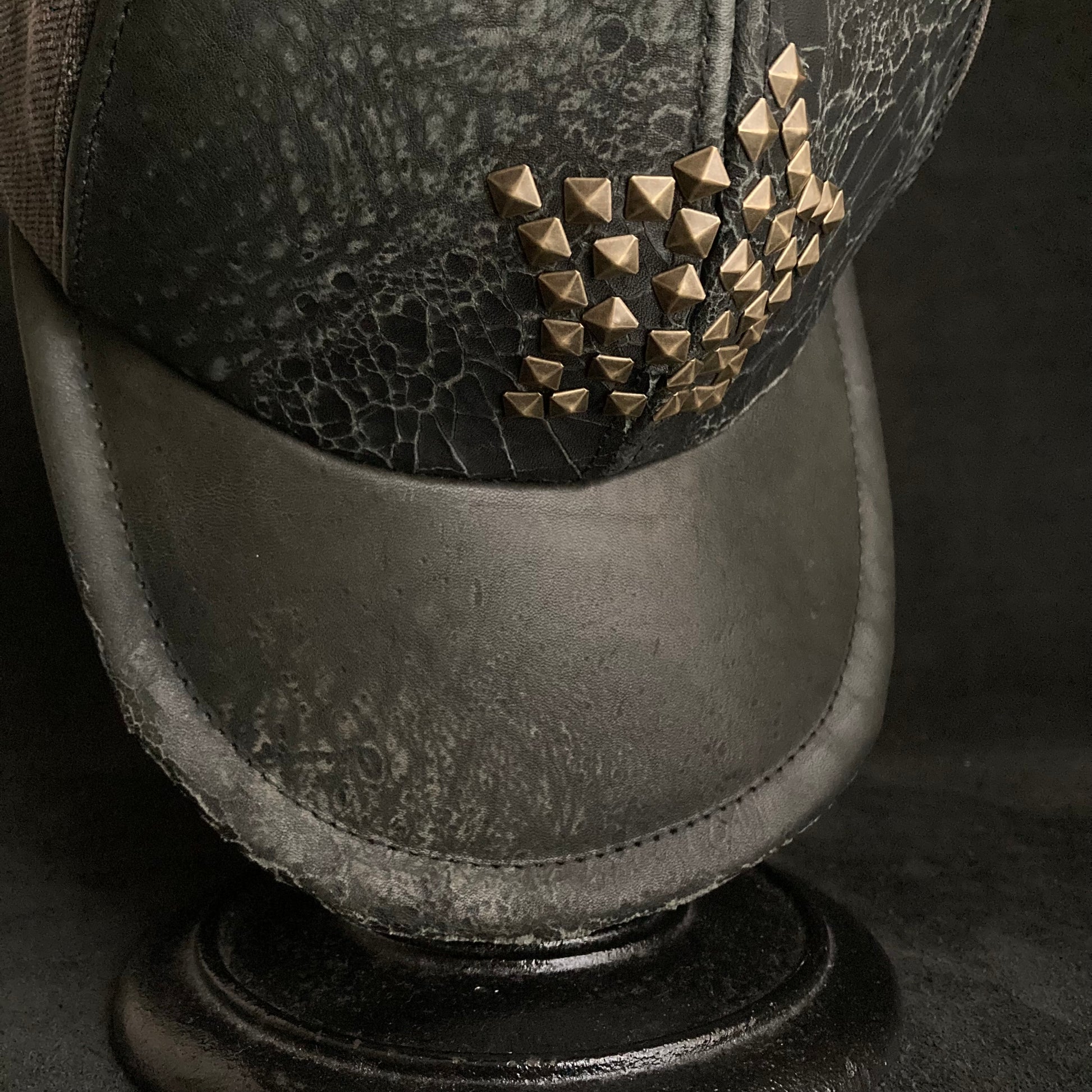クラックレザーとペイントデニムを組み合わせたキャップ。