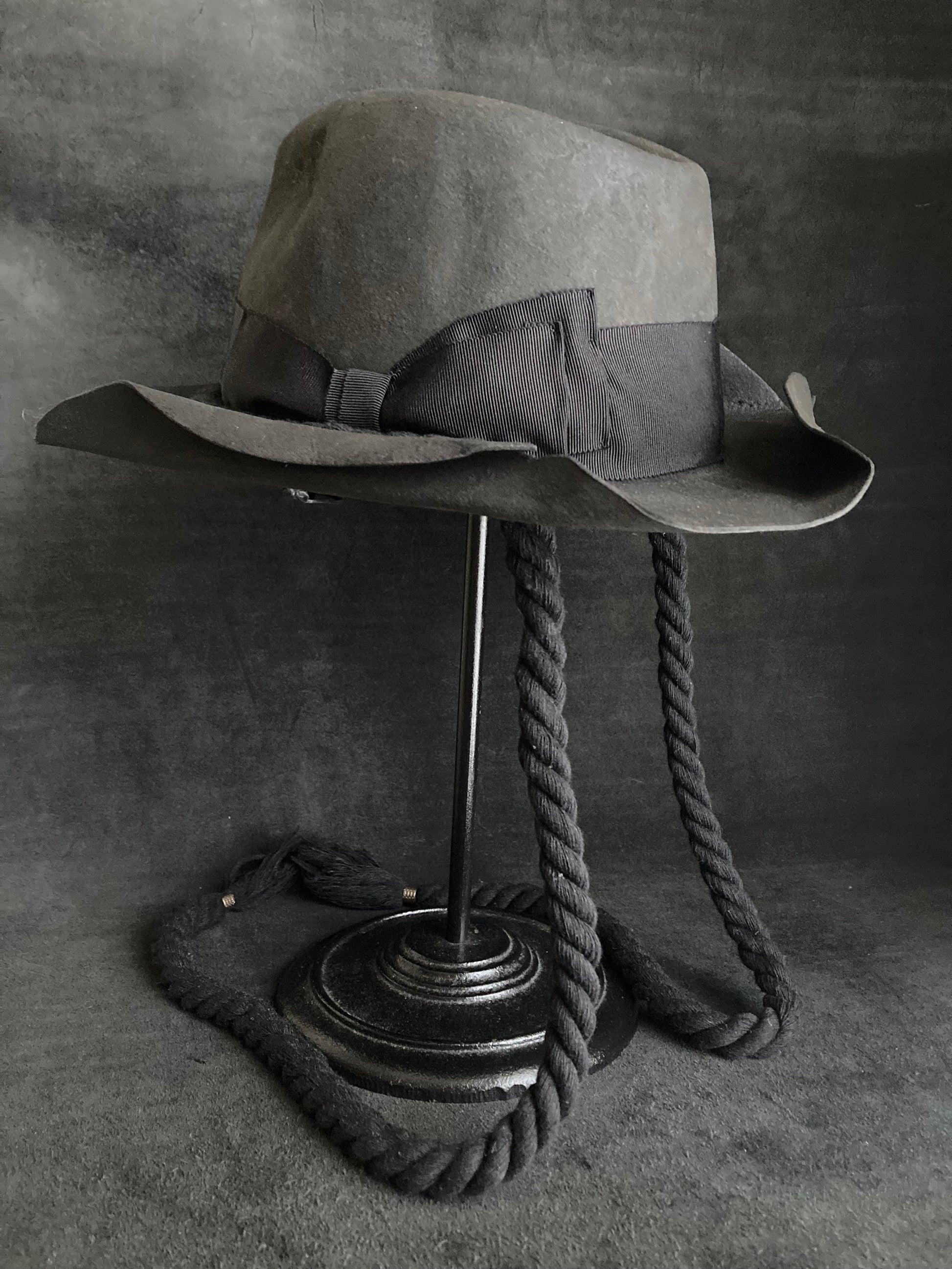 ブリムにハトメで穴をあけて、耳の後ろにロープが垂れ下がるようにしています。(垂れ下がっているロープの長さ 約60cm)