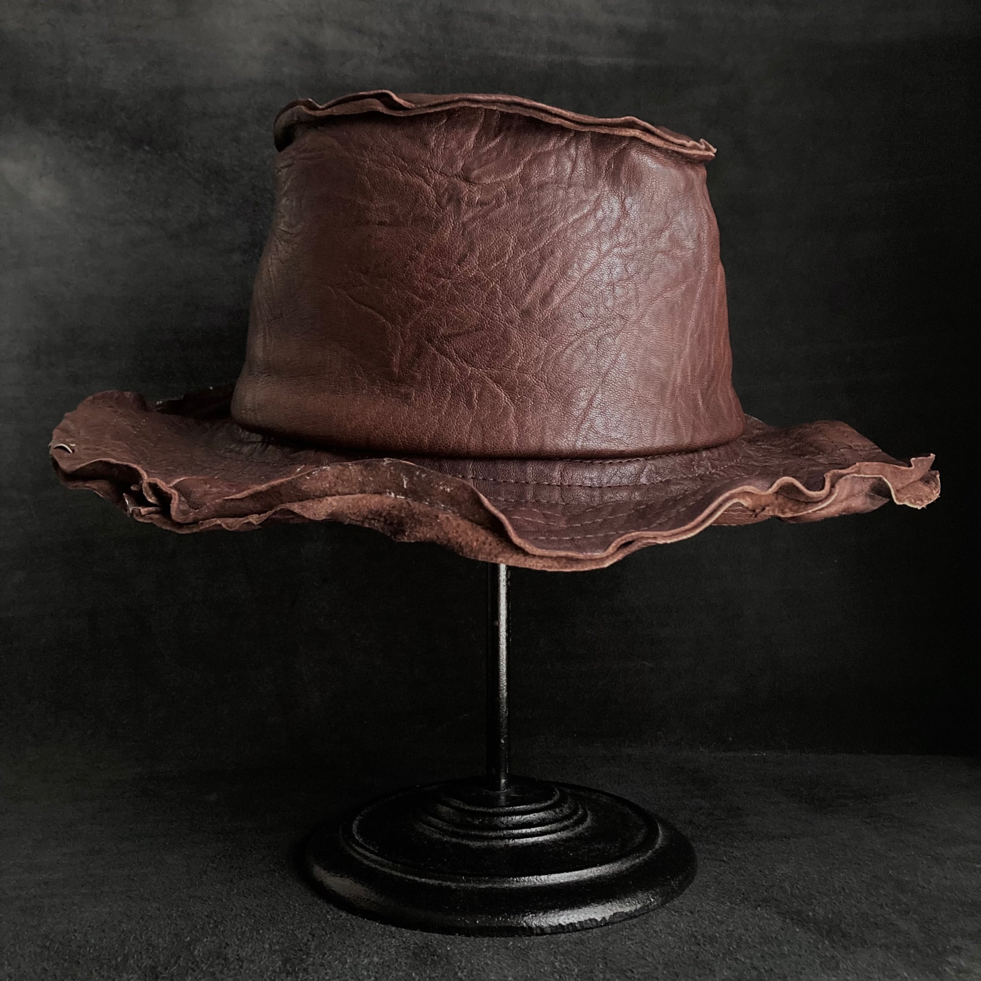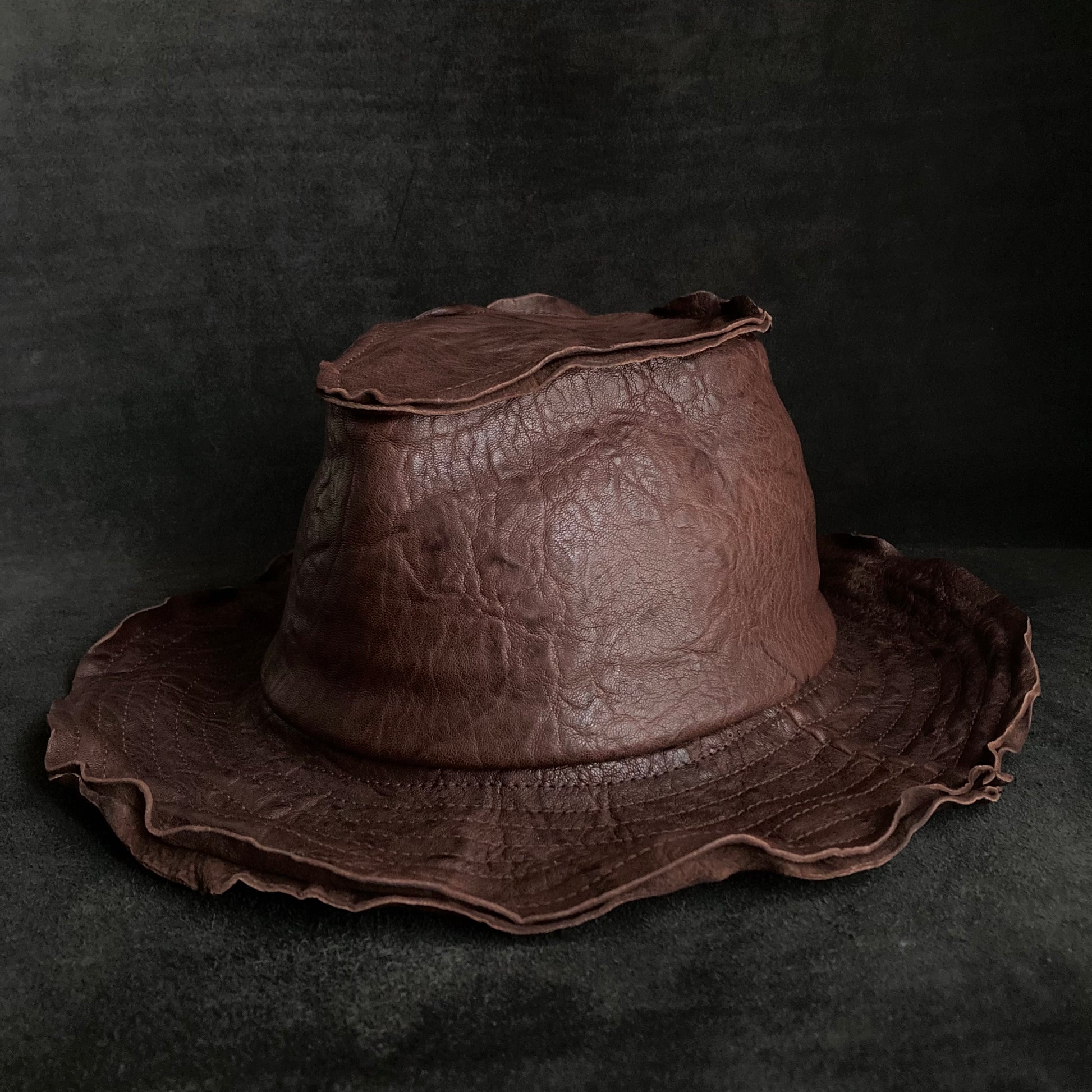 シワ加工のブラウンレザーを使用して制作した中折れハット。