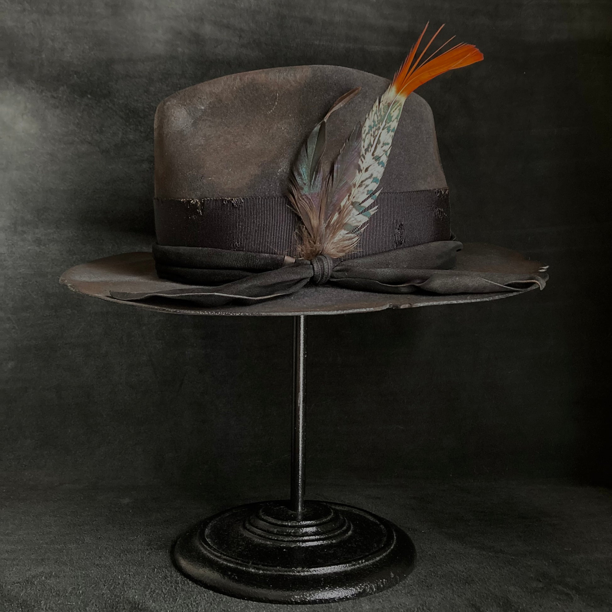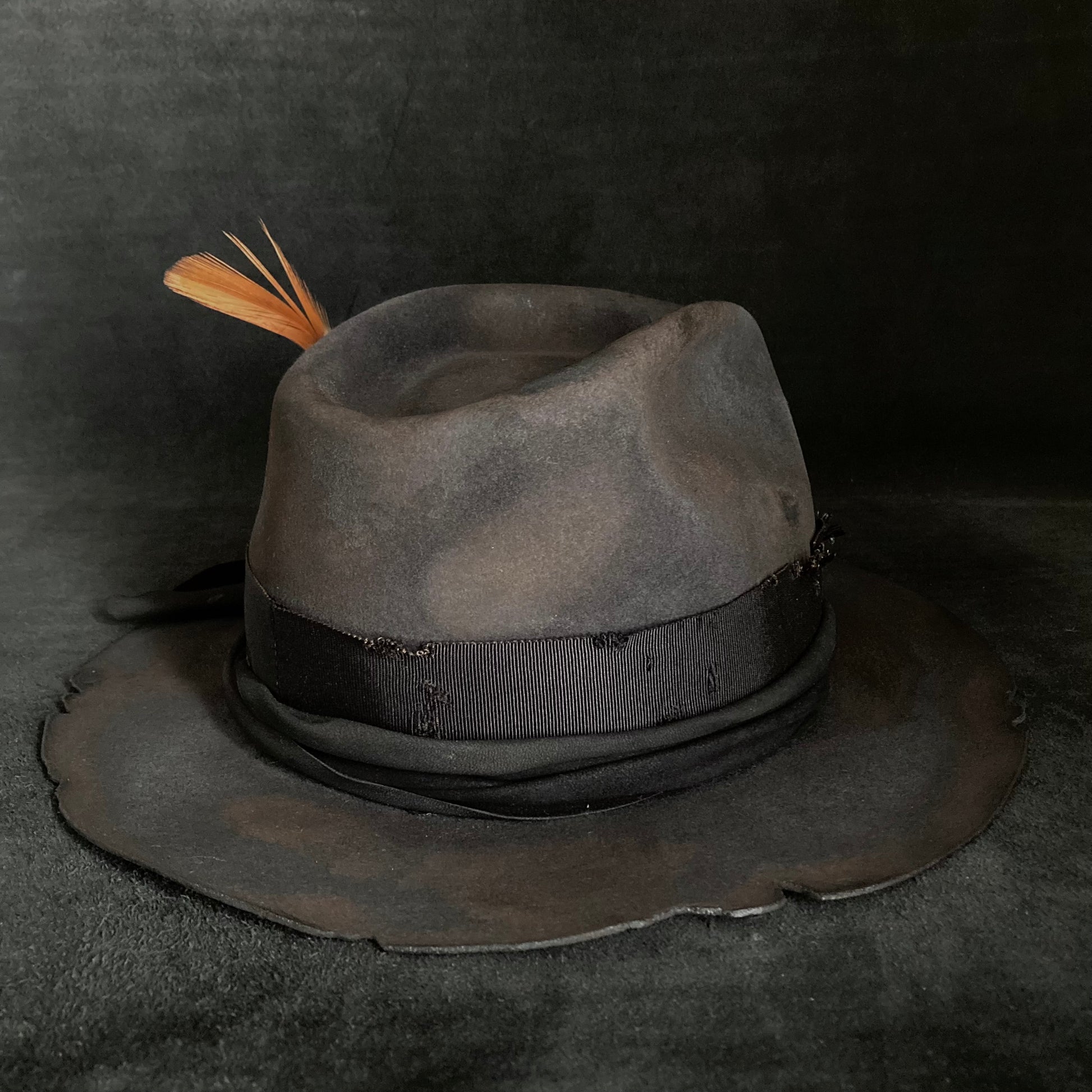 飾りには、ダメージ加工したグログランリボンとバーン加工したレザーを巻きました。